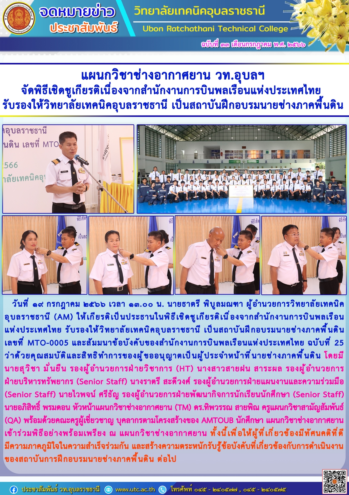 แผนกวิชาช่างอากาศยาน วท.อุบลฯ จัดพิธีเชิดชูเกียรติเนื่องจากสำนักงานการบินพลเรือนแห่งประเทศไทย รับรองให้วิทยาลัยเทคนิคอุบลราชธานี เป็นสถาบันฝึกอบรมนายช่างภาคพื้นดิน
