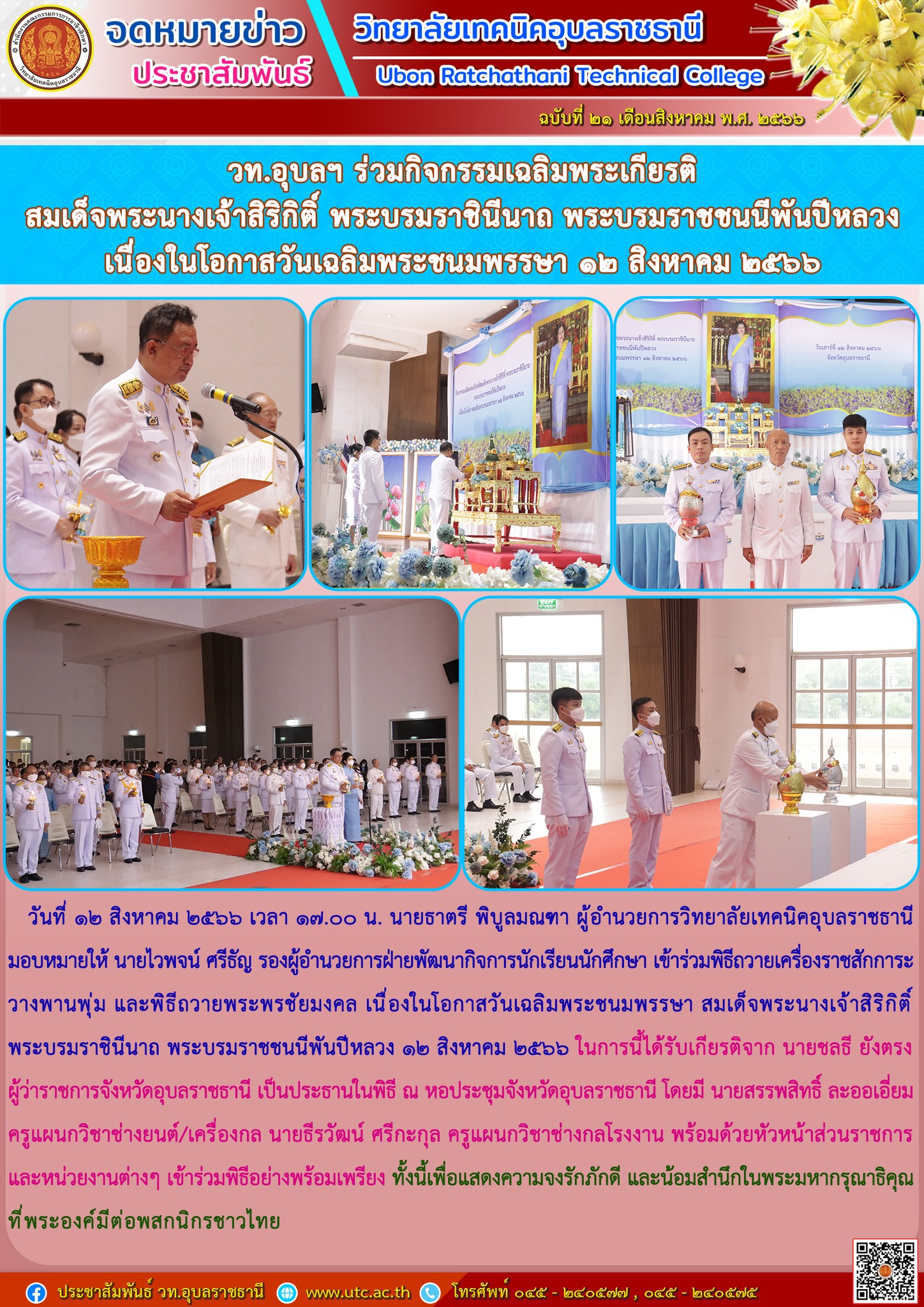 วันที่ ๑๒ สิงหาคม ๒๕๖๖ เวลา ๐๗.๐๐ น. นายธาตรี พิบูลมณฑา ผู้อำนวยการวิทยาลัยเทคนิคอุบลราชธานี (เพิ่มเติม…)