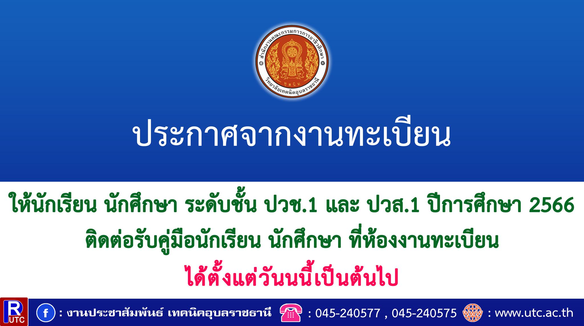ประกาศจากงานทะเบียน ให้นักเรียน นักศึกษา ระดับชั้น ปวช.1 และ ปวส.1 ปีการศึกษา 2566 ติดต่อรับคู่มือนักเรียน นักศึกษา ที่ห้องงานทะเบียน