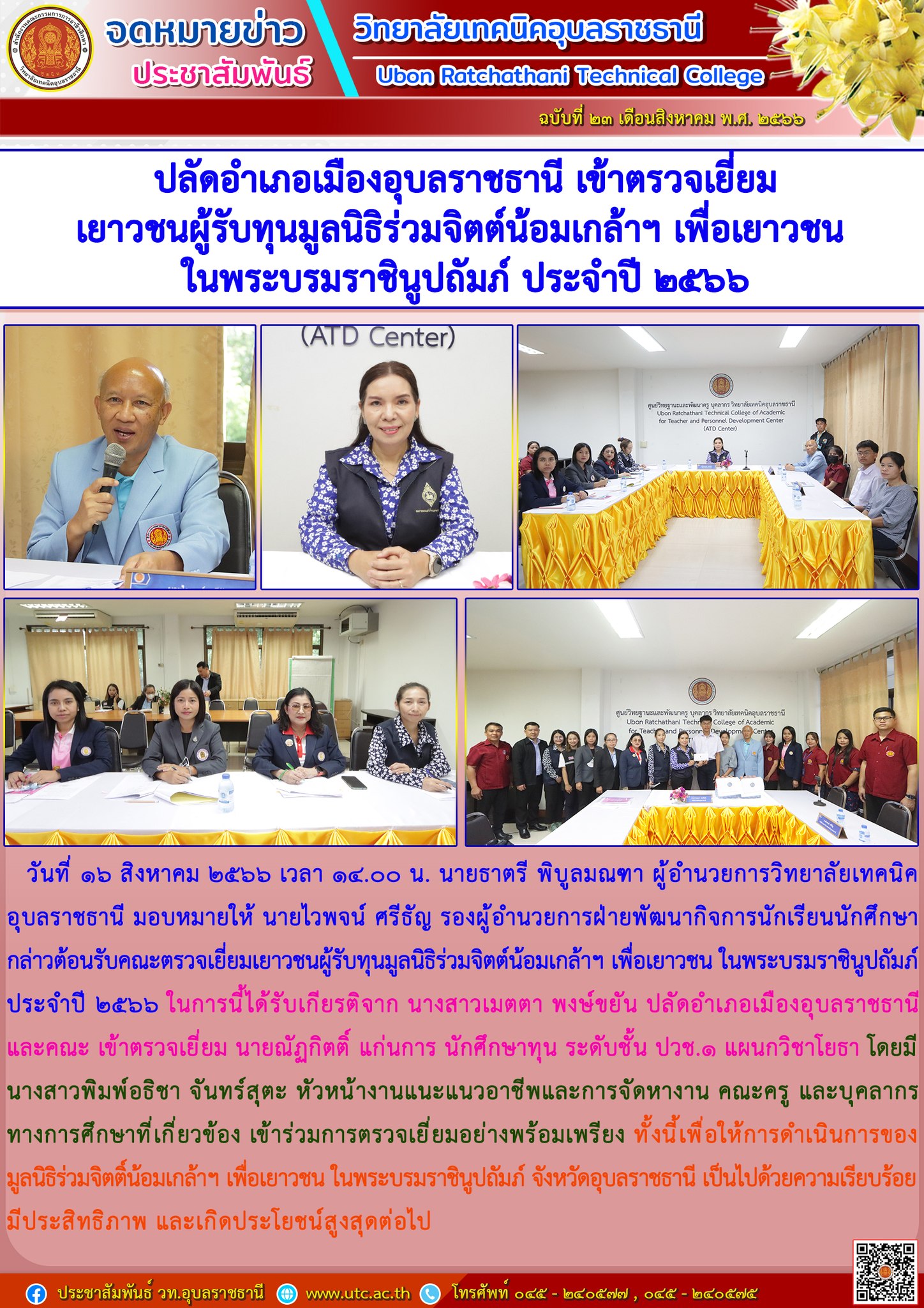 วันที่ ๑๖ สิงหาคม ๒๕๖๖ เวลา ๐๗.๐๐ น. นายธาตรี พิบูลมณฑา ผู้อำนวยการวิทยาลัยเทคนิคอุบลราชธานี พร้อมด้วย นางสาวสายฝน สาระผล รองผู้อำนวยการฝ่ายบริหารทรัพยากร (เพิ่มเติม…)