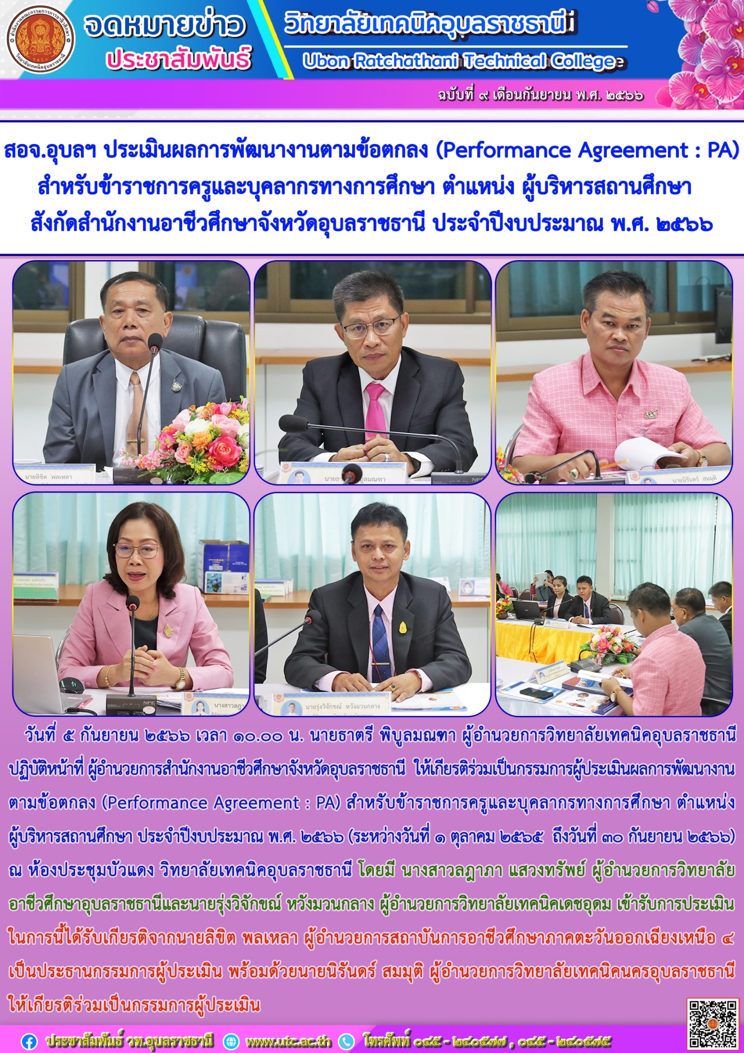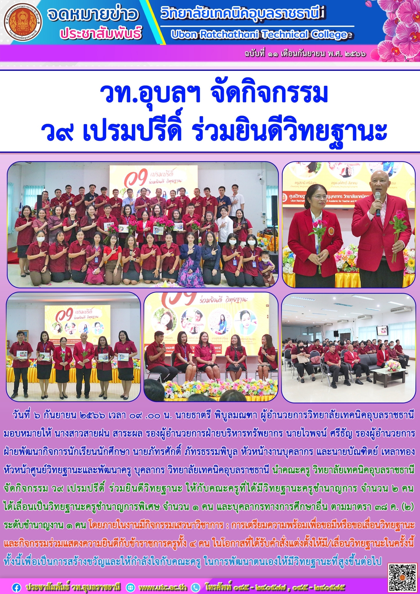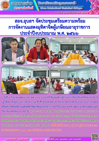 วันที่ ๖ กันยายน ๒๕๖๖ เวลา ๑๓.๐๐ น. นายธาตรี พิบูลมณฑา ผู้อำนวยการวิทยาลัยเทคนิคอุบลราชธานี (เพิ่มเติม…)