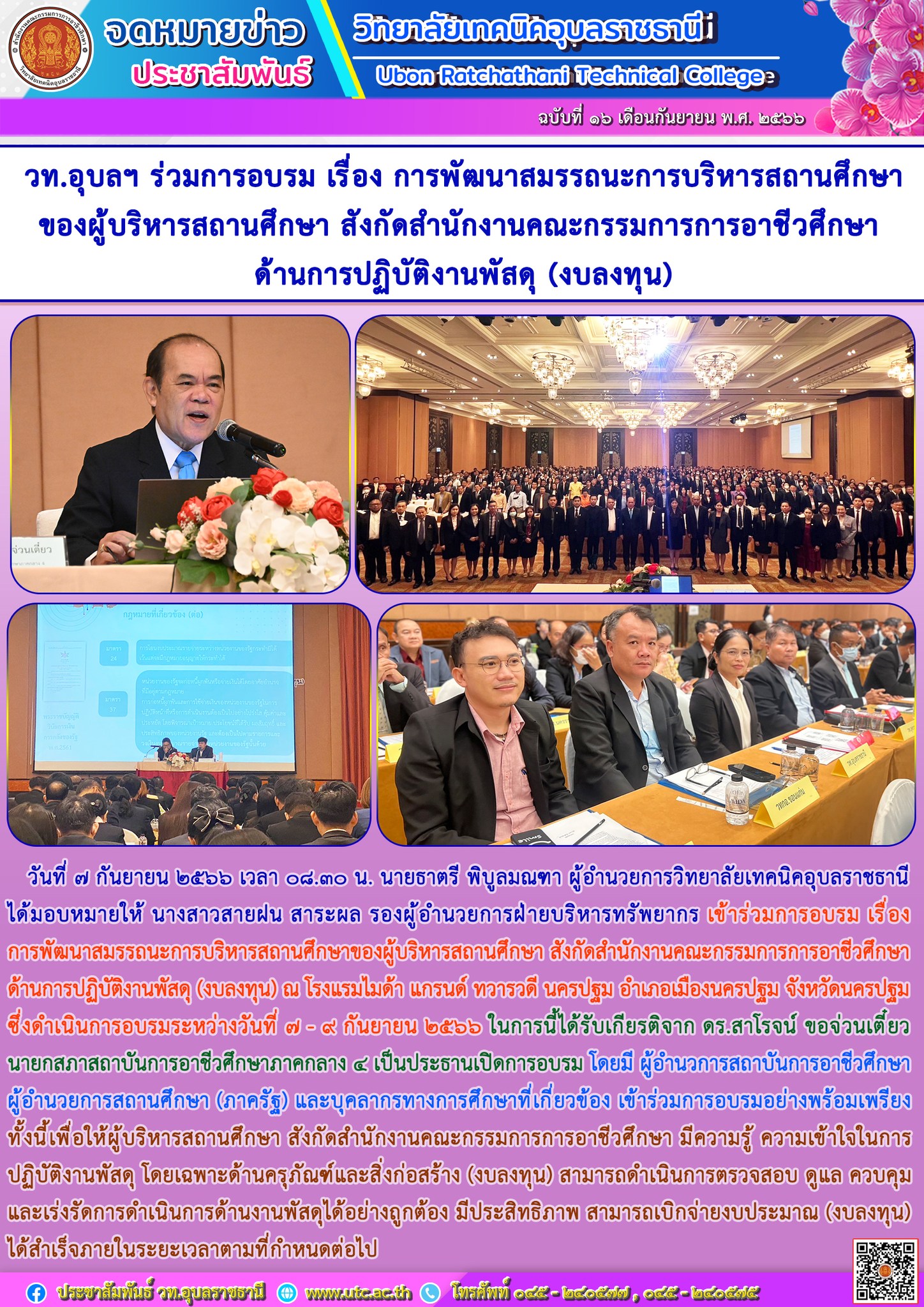 วท.อุบลฯ เข้าร่วมการอบรม เรื่อง การพัฒนาสมรรถนะการบริหารสถานศึกษาของผู้บริหารสถานศึกษา สังกัดสำนักงานคณะกรรมการการอาชีวศึกษา ด้านการปฏิบัติงานพัสดุ (งบลงทุน)