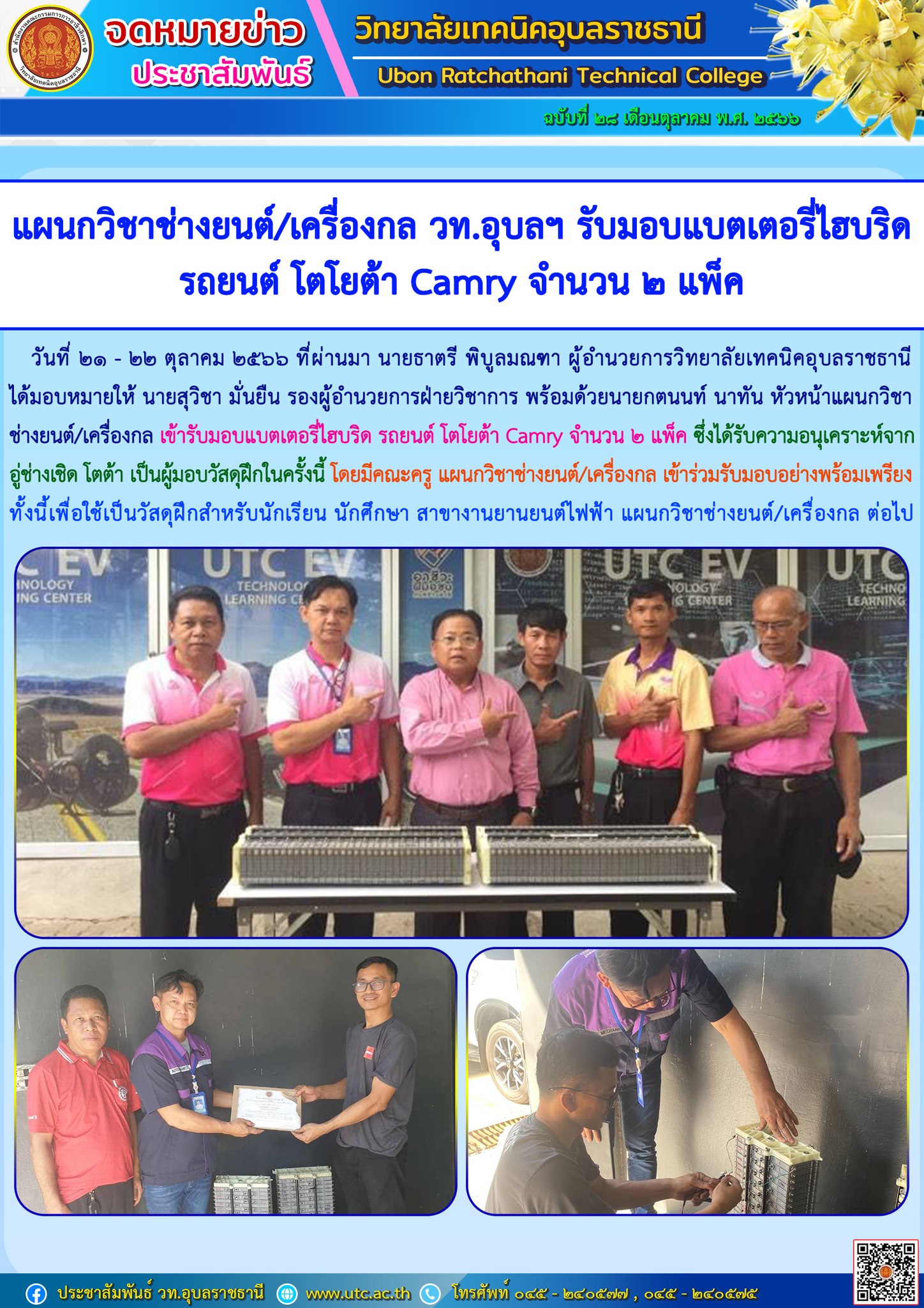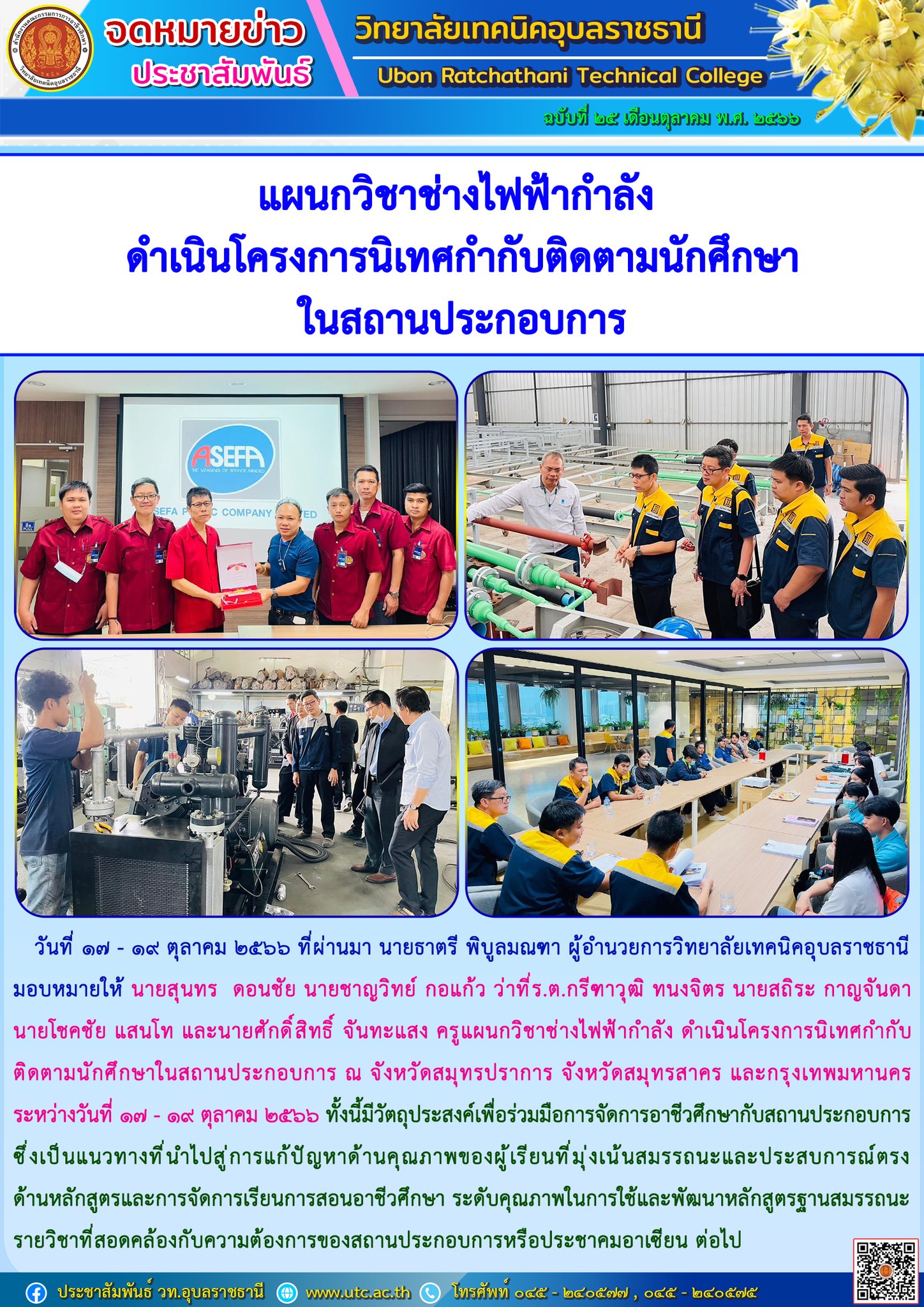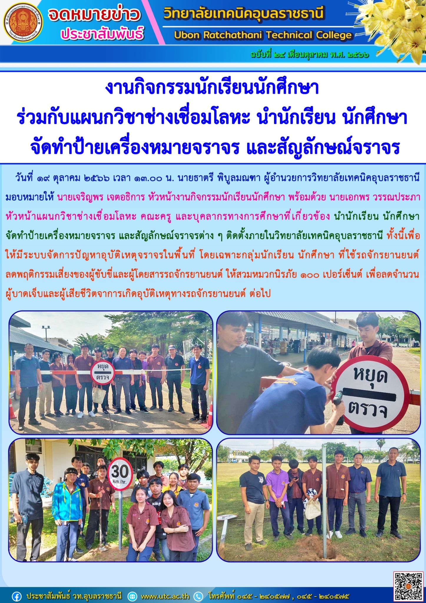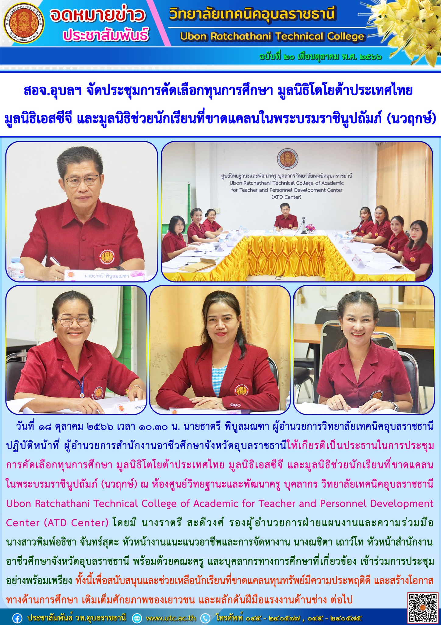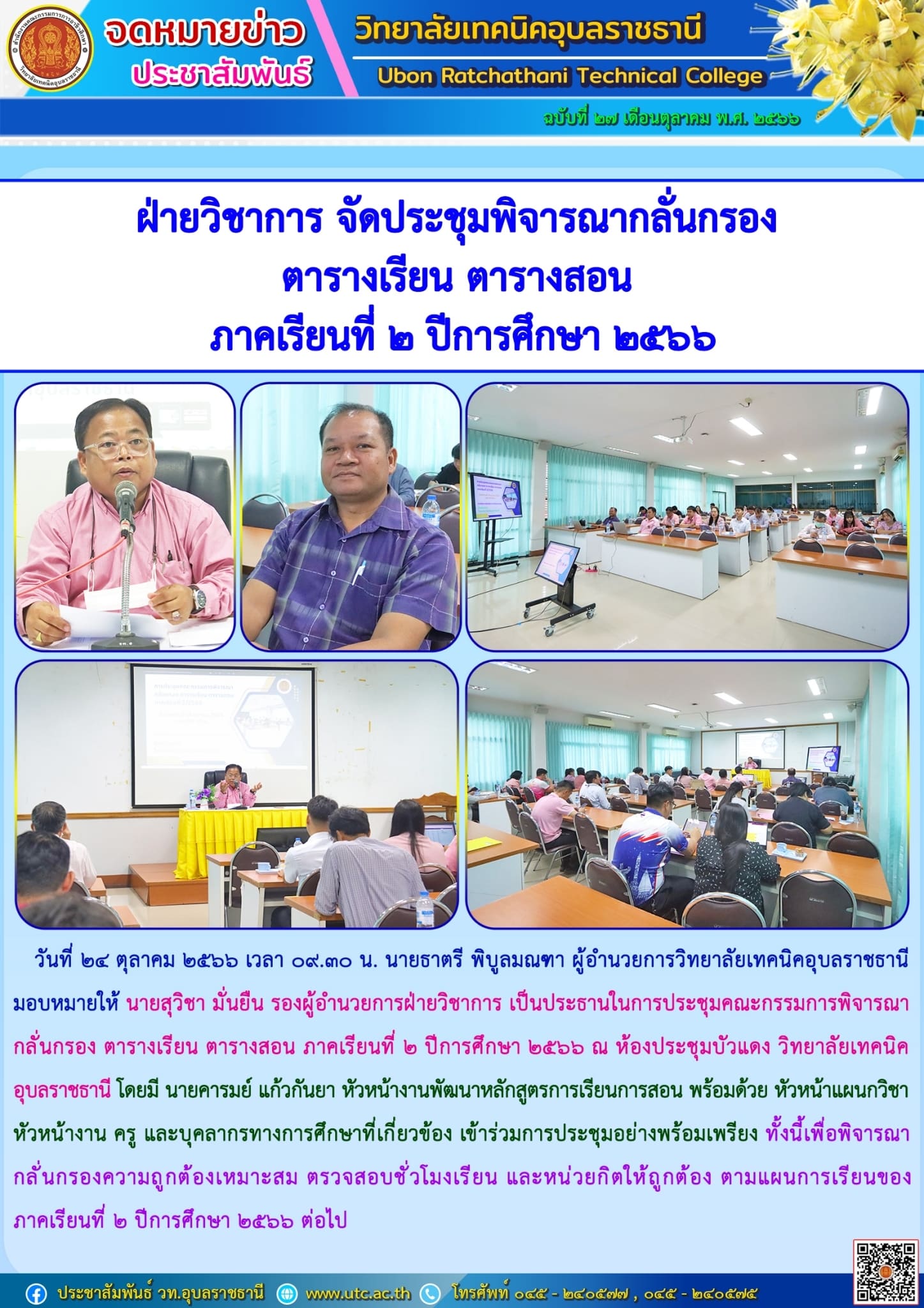 วันที่ ๒๖ ตุลาคม ๒๕๖๖ เวลา ๐๖.๐๐ น. นายธาตรี พิบูลมณฑา ผู้อำนวยการวิทยาลัยเทคนิคอุบลราชธานี ได้มอบหมายให้ นายไวพจน์ ศรีธัญ รองผู้อำนวยการฝ่ายพัฒนากิจการนักเรียนนักศึกษา เข้าร่วมการประชุม (เพิ่มเติม…)