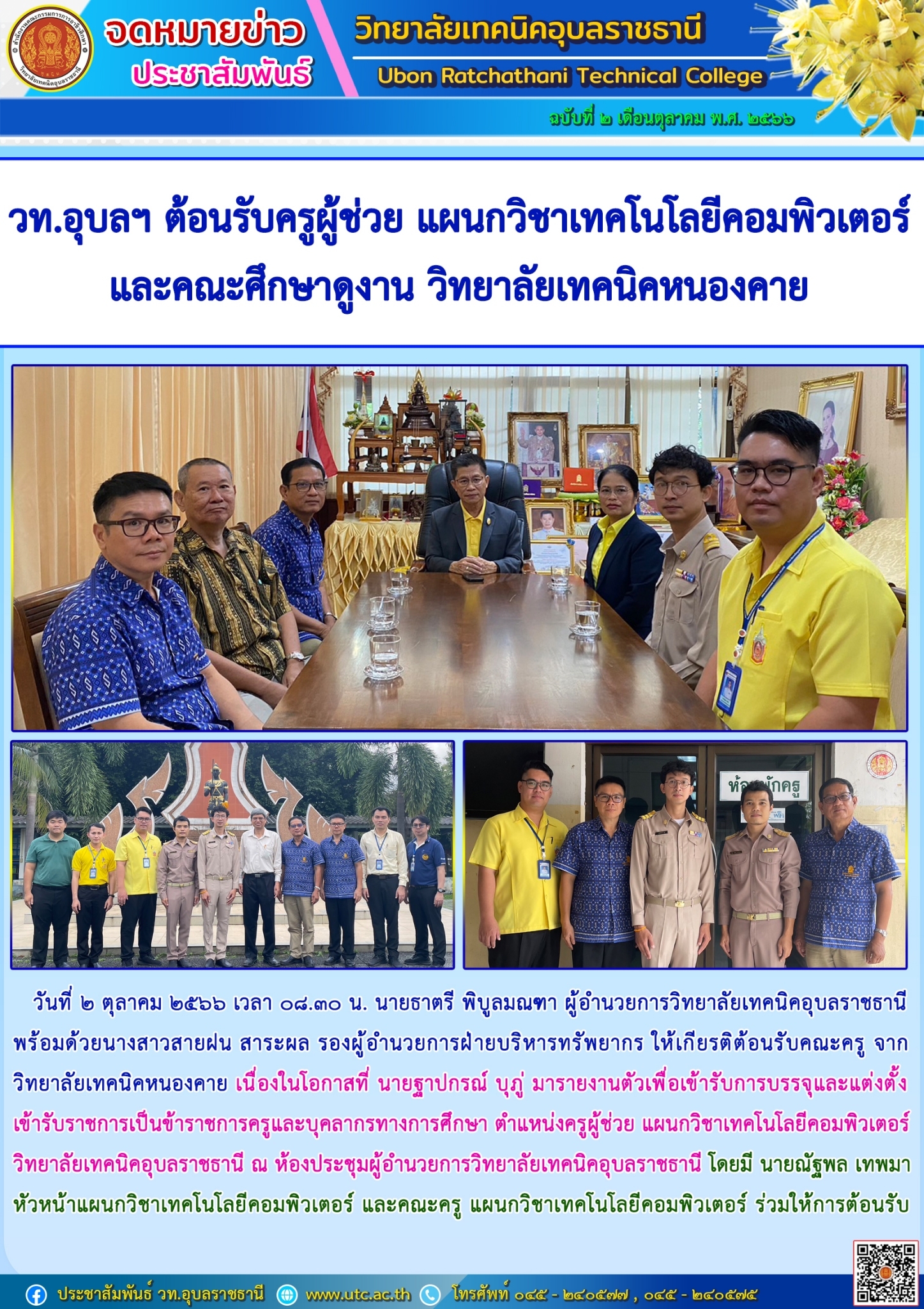 วันที่ ๒ ตุลาคม ๒๕๖๖ เวลา ๐๘.๓๐ น. นายธาตรี พิบูลมณฑา ผู้อำนวยการวิทยาลัยเทคนิคอุบลราชธานี พร้อมด้วยนางสาวสายฝน สาระผล รอ (เพิ่มเติม…)