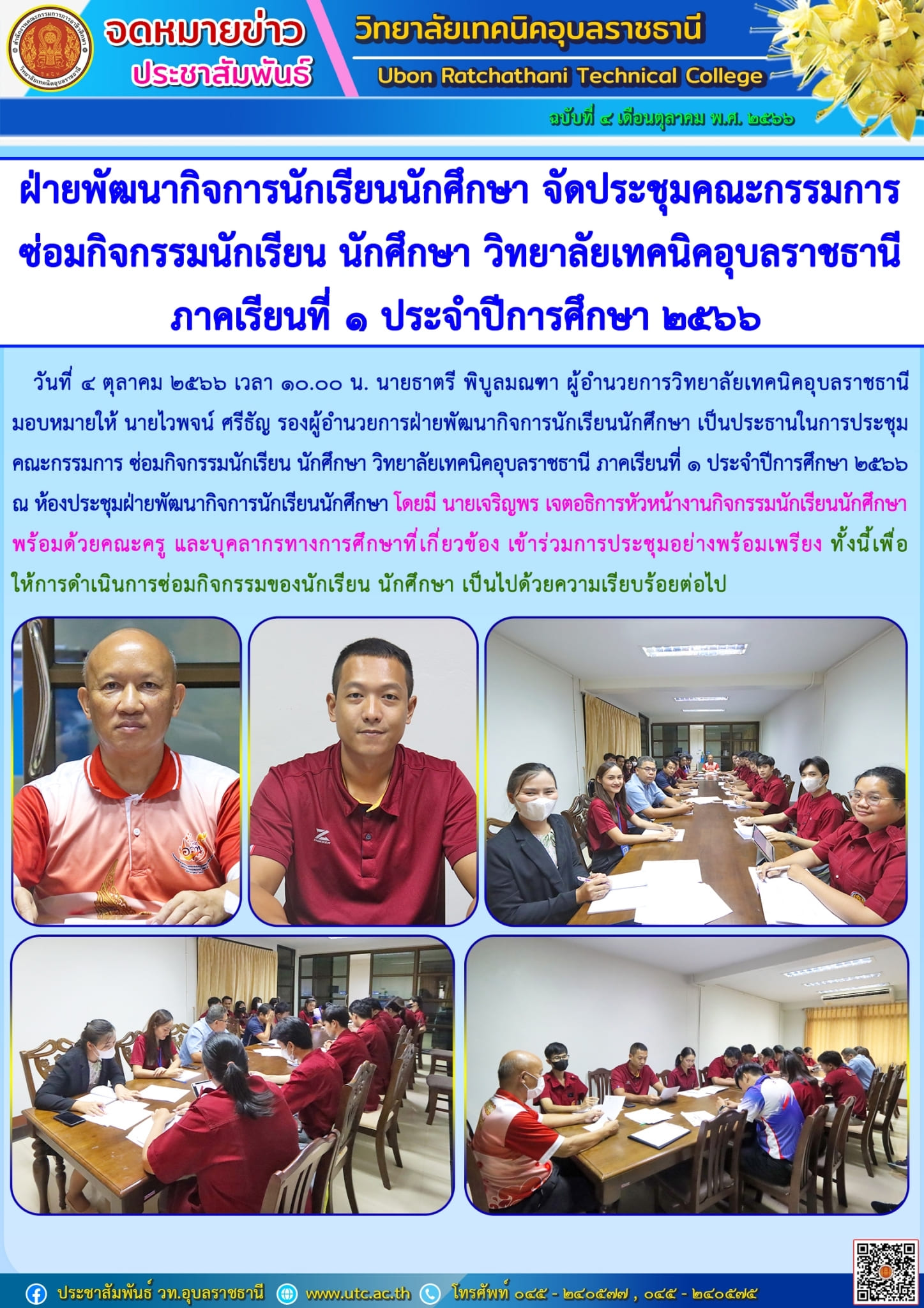 วันที่ ๔ ตุลาคม ๒๕๖๖ เวลา ๑๓.๓๐ น. นายธาตรี พิบูลมณฑา ผู้อำนวยการวิทยาลัยเทคนิคอุบลราชธานี มอบหมายให้ นายกตนนท์ นาทัน หัวหน้าแผนกวิชาช่างยนต์/เครื่องกล เข้าสำ (เพิ่มเติม…)