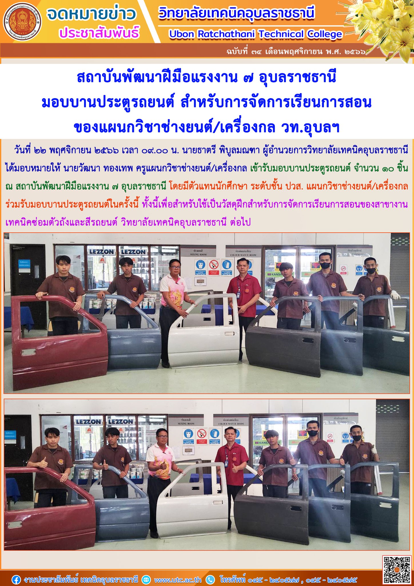 สถาบันพัฒนาฝีมือแรงงาน ๗ อุบลราชธานี มอบบานประตูรถยนต์ สำหรับการจัดการเรียนการสอนของแผนกวิชาช่างยนต์/เครื่องกล วท.อุบลฯ