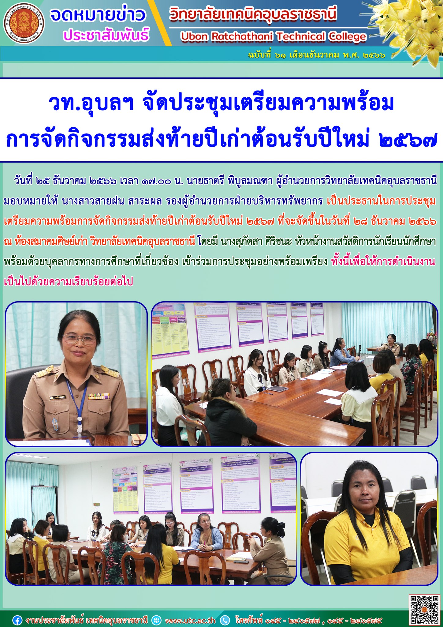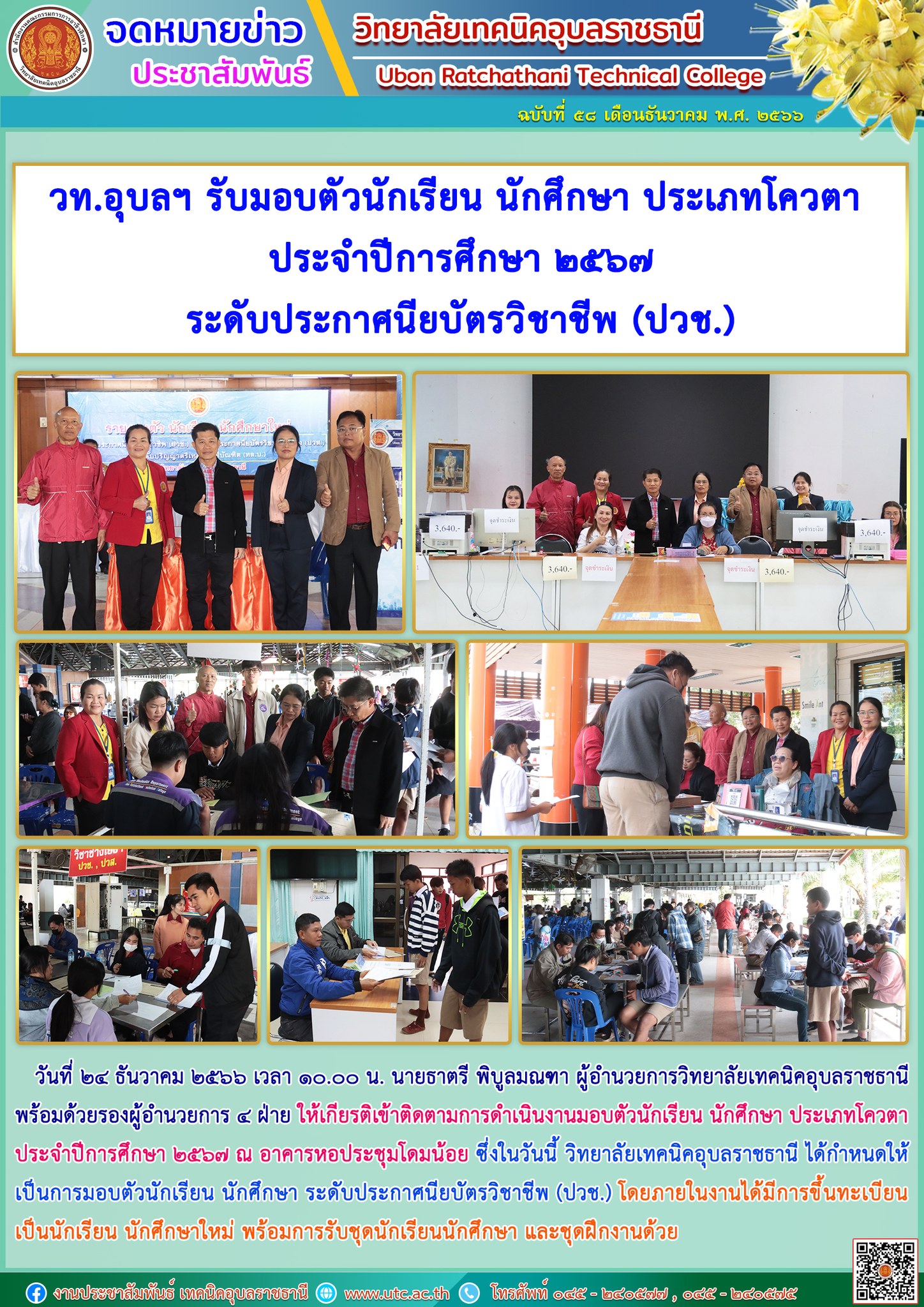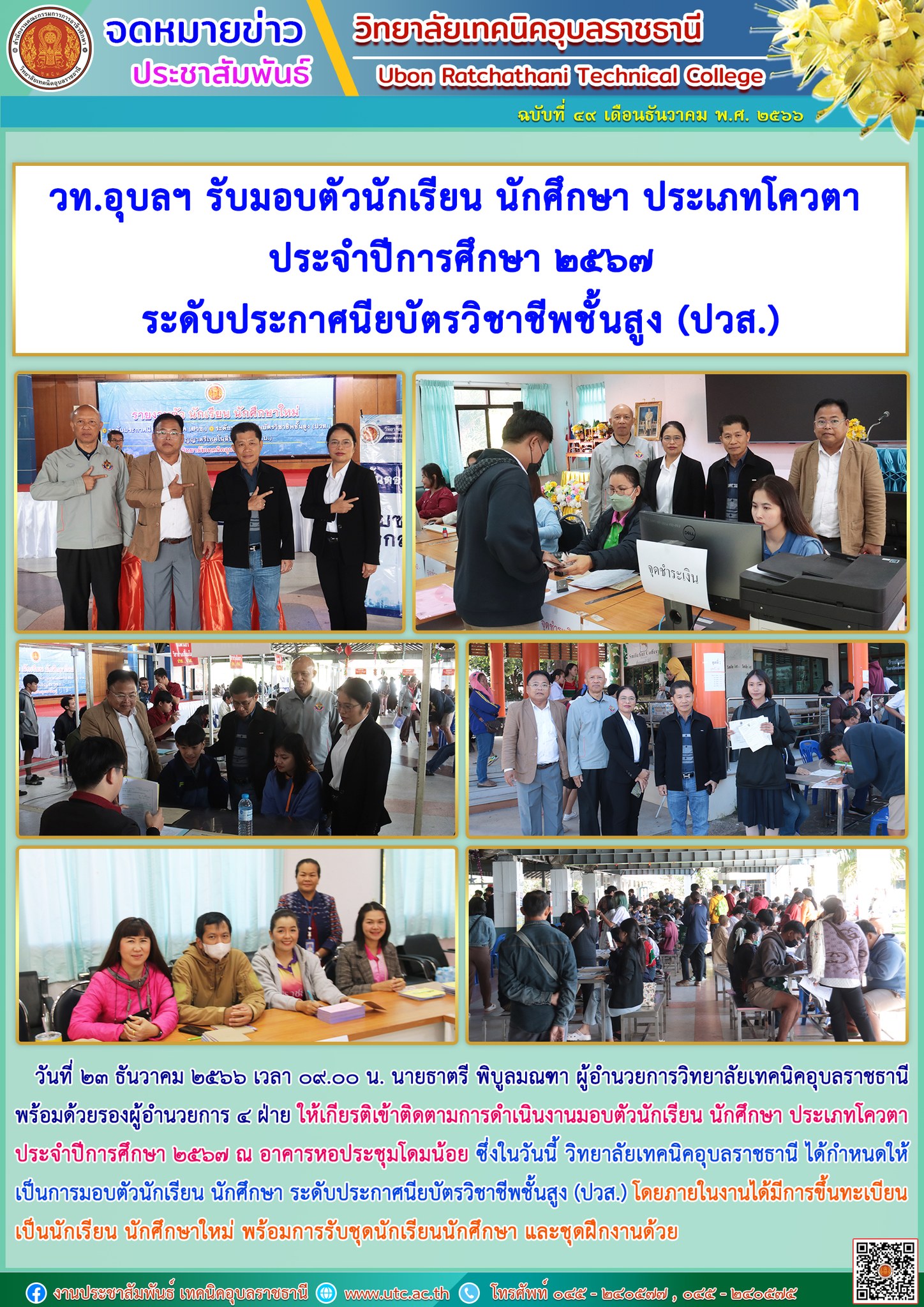วันที่ ๒๕ ธันวาคม ๒๕๖๖ เวลา ๑๗.๐๐ น. นายธาตรี พิบูลมณฑา ผู้อำนวยการวิทยาลัยเทคนิคอุบลราชธานี มอบหมายให้ นางสาวสายฝน สาระผล รองผู้อำนวยการฝ่ายบริหาร (เพิ่มเติม…)
