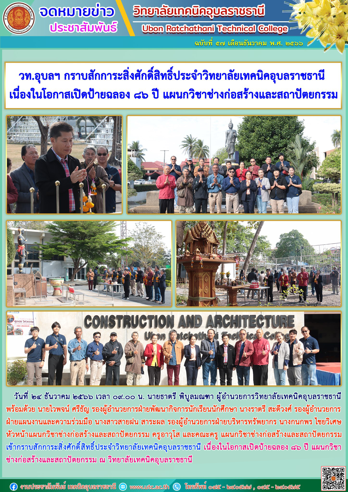 คณะครู แผนกวิชาช่างก่อสร้างและสถาปัตยกรรม เข้ากราบสักการะสิ่งศักดิ์สิทธิ์ประจำวิทยาลัยเทคนิคอุบลราชธานี เนื่องในโอกาสเปิดป้ายฉลอง ๘๖ ปี แผนกวิชาช่างก่อสร้างและสถาปัตยกรรม