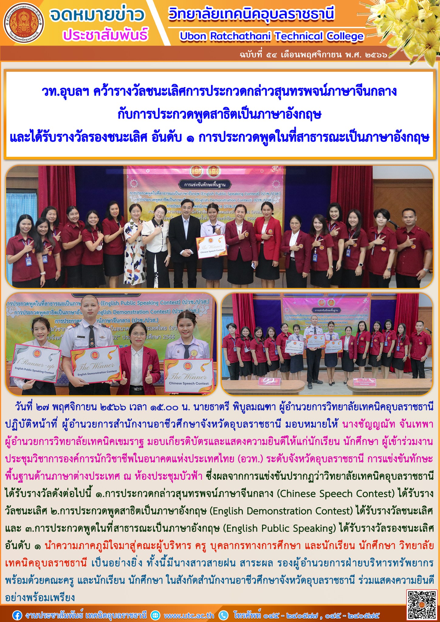 วท.อุบลฯ คว้ารางวัลชนะเลิศการประกวดกล่าวสุนทรพจน์ภาษาจีนกลาง กับการประกวดพูดสาธิตเป็นภาษาอังกฤษ