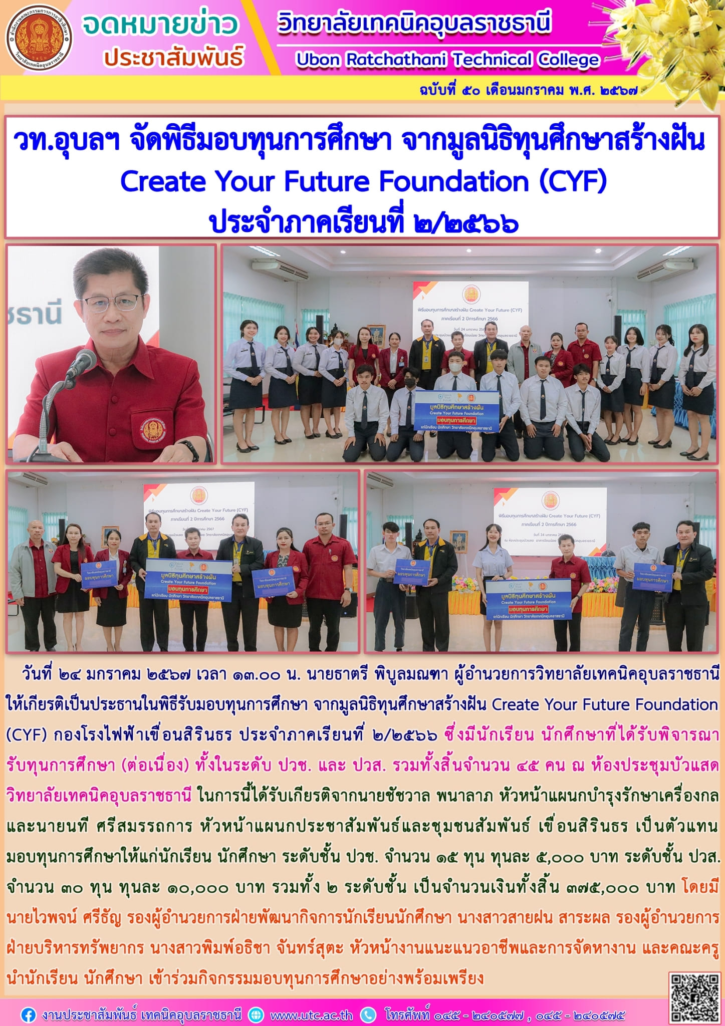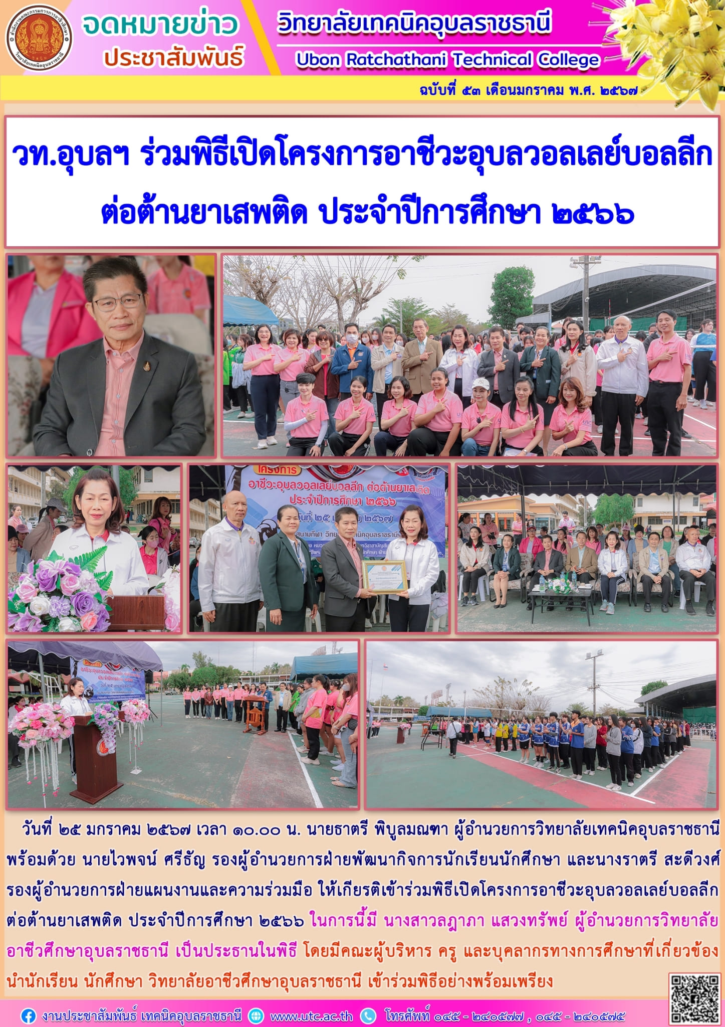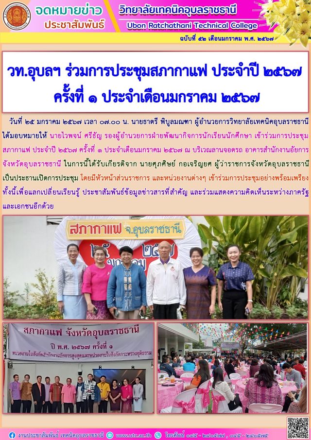 วันที่ ๒๖ มกราคม ๒๕๖๗ เวลา ๐๙.๓๐ น. นายธาตรี พิบูลมณฑา ผู้อำนวยการวิทยาลัยเทคนิคอุบลราชธานี (เพิ่มเติม…)