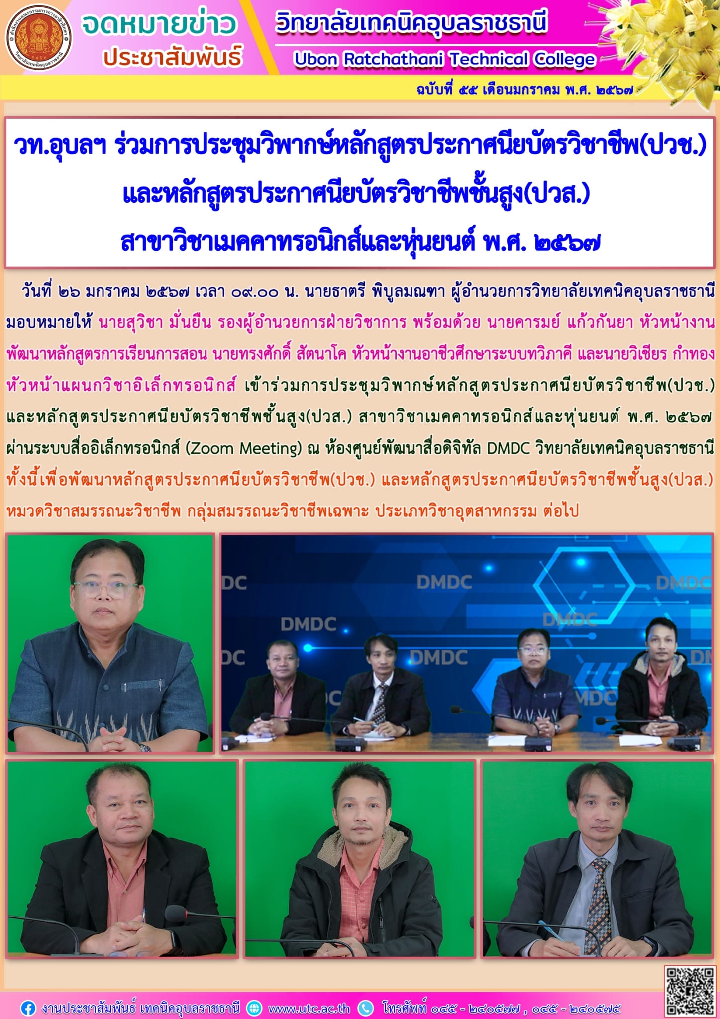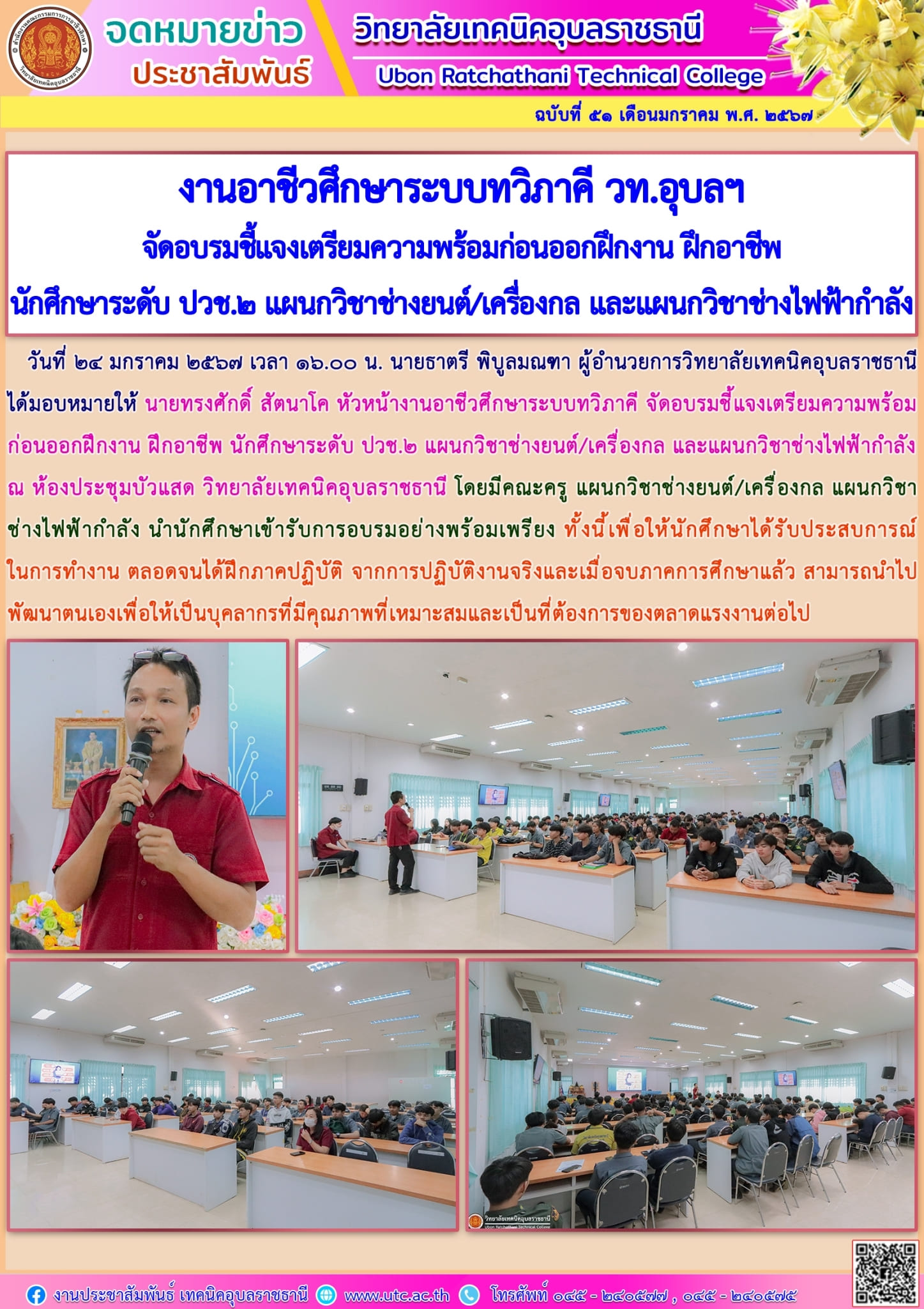 วันที่ ๒๔ มกราคม ๒๕๖๗ เวลา ๑๓.๐๐ น. นายธาตรี พิบูลมณฑา ผู้อำนวยการวิทยาลัยเทคนิคอุบลราชธานี (เพิ่มเติม…)