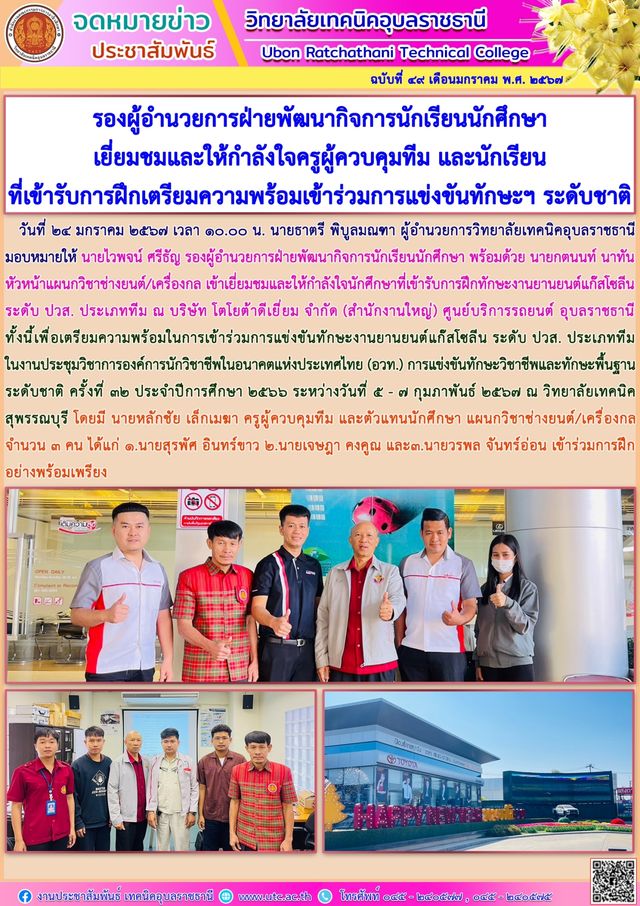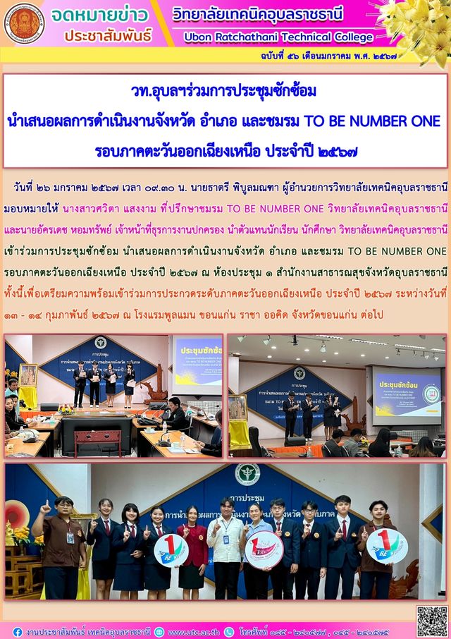 วันที่ ๒๕ มกราคม ๒๕๖๗ เวลา ๑๐.๐๐ น. นายธาตรี พิบูลมณฑา ผู้อำนวยการวิทยาลัยเทคนิคอุบลราชธานี พร้อมด้วย นายไวพจน์ ศรีธัญ รองผู้อำนวยการฝ่ายพัฒนากิจการ (เพิ่มเติม…)