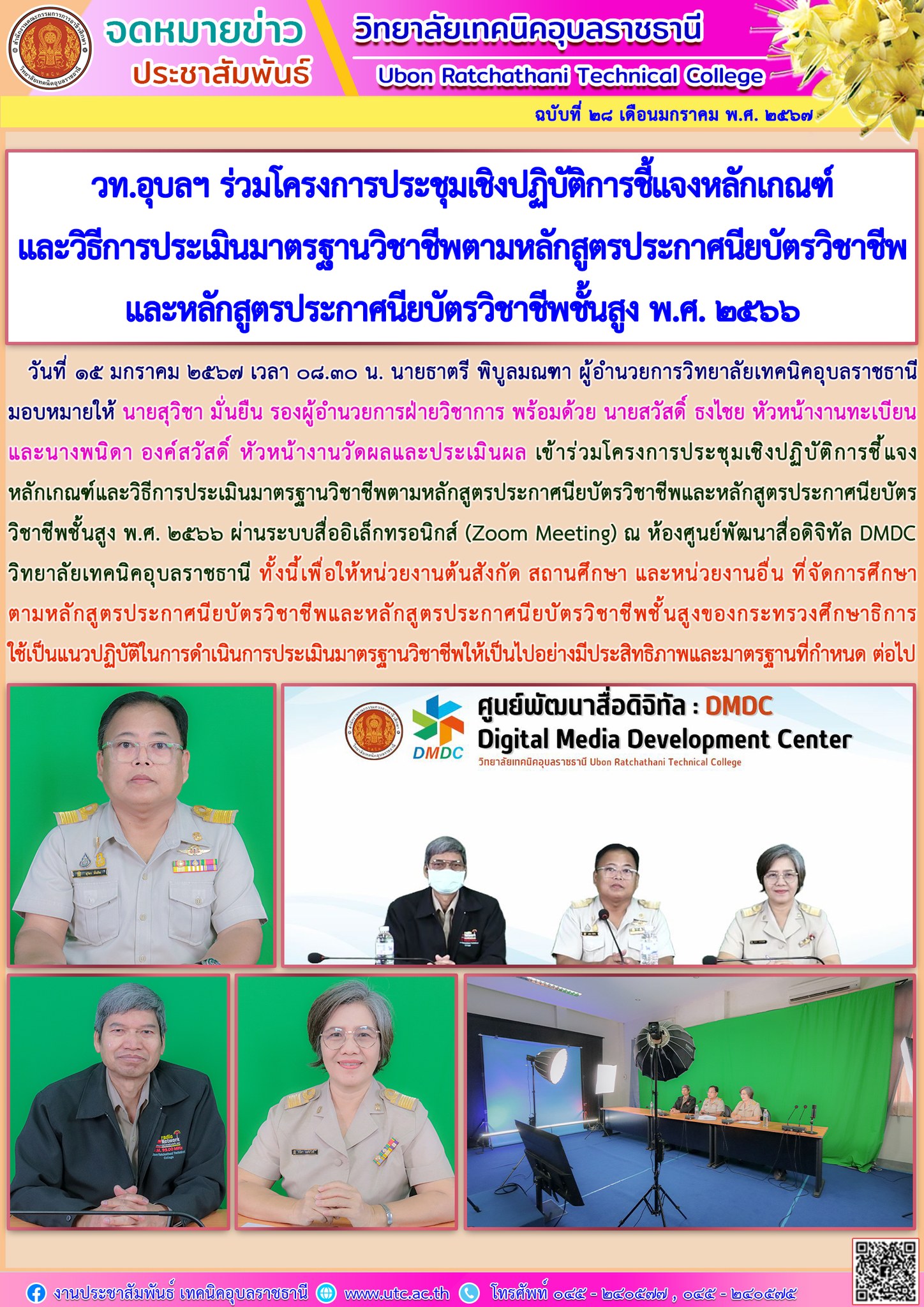 วันที่ ๑๕ มกราคม ๒๕๖๗ เวลา ๑๑.๓๐ น. นายธาตรี พิบูลมณฑา ผู้อำนวยการวิทยาลัยเทคนิคอุบลราชธานี มอบหมายให้ นายสุวิชา มั่นยืน รองผู้อำนวยการฝ่ายวิชาการ เข้าร่วมการ (เพิ่มเติม…)