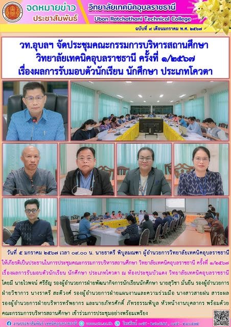 การประชุมคณะกรรมการบริหารสถานศึกษา วิทยาลัยเทคนิคอุบลราชธานี ครั้งที่ ๑/๒๕๖๗ เรื่องผลการรับมอบตัวนักเรียน นักศึกษา ประเภทโควตา