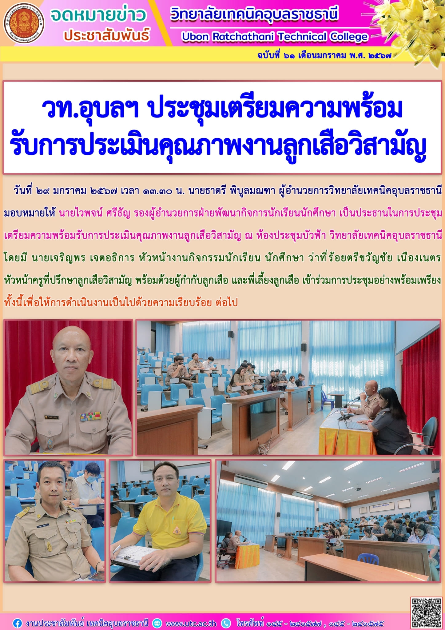 วันที่ ๒๙ มกราคม ๒๕๖๗ เวลา ๐๙.๐๐ น. นายธาตรี พิบูลมณฑา ผู้อำนวยการวิทยาลัยเทคนิคอุบลราชธานี มอบหมายให้ นายอัครเดช หอมทรัพย์ (เพิ่มเติม…)