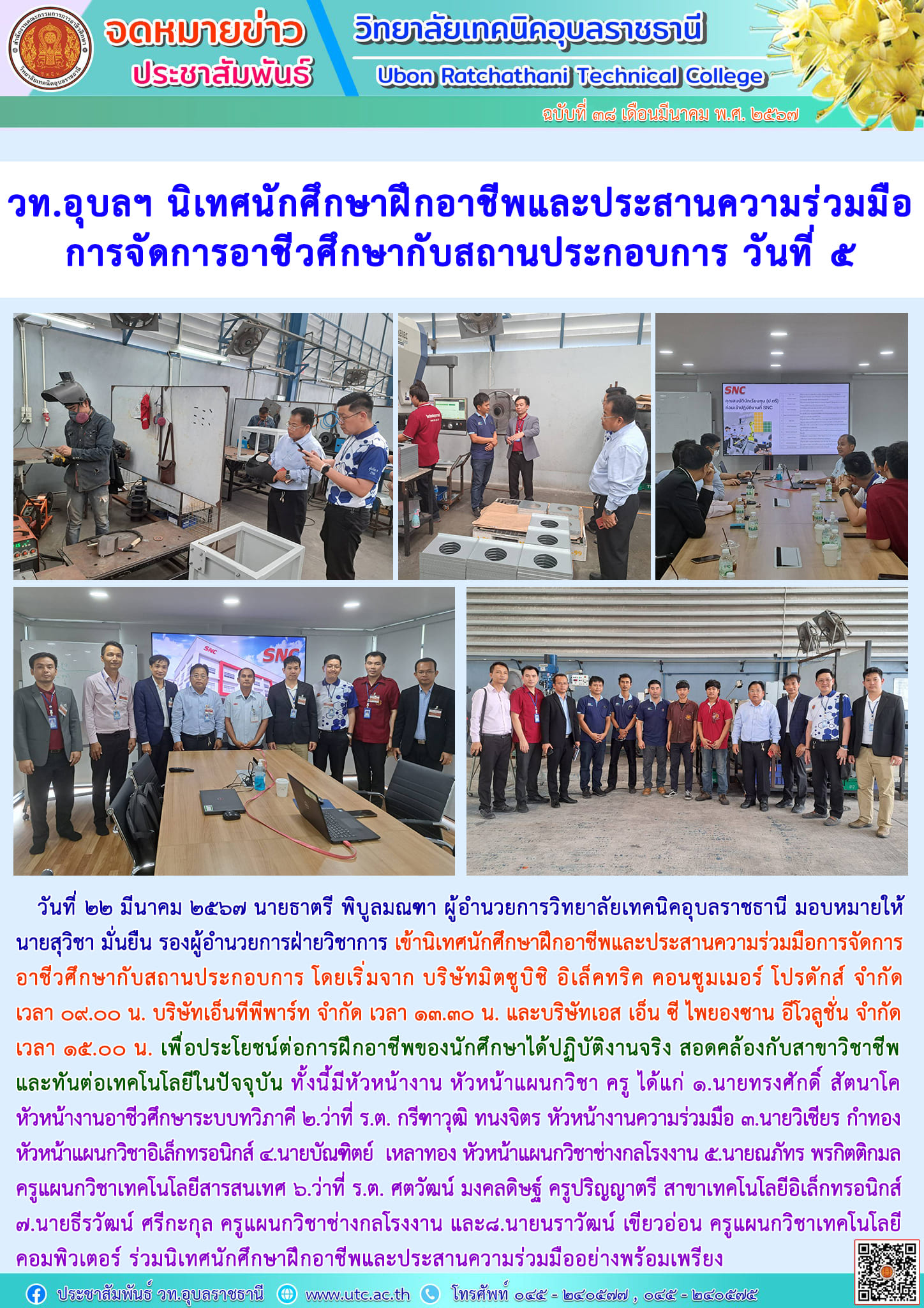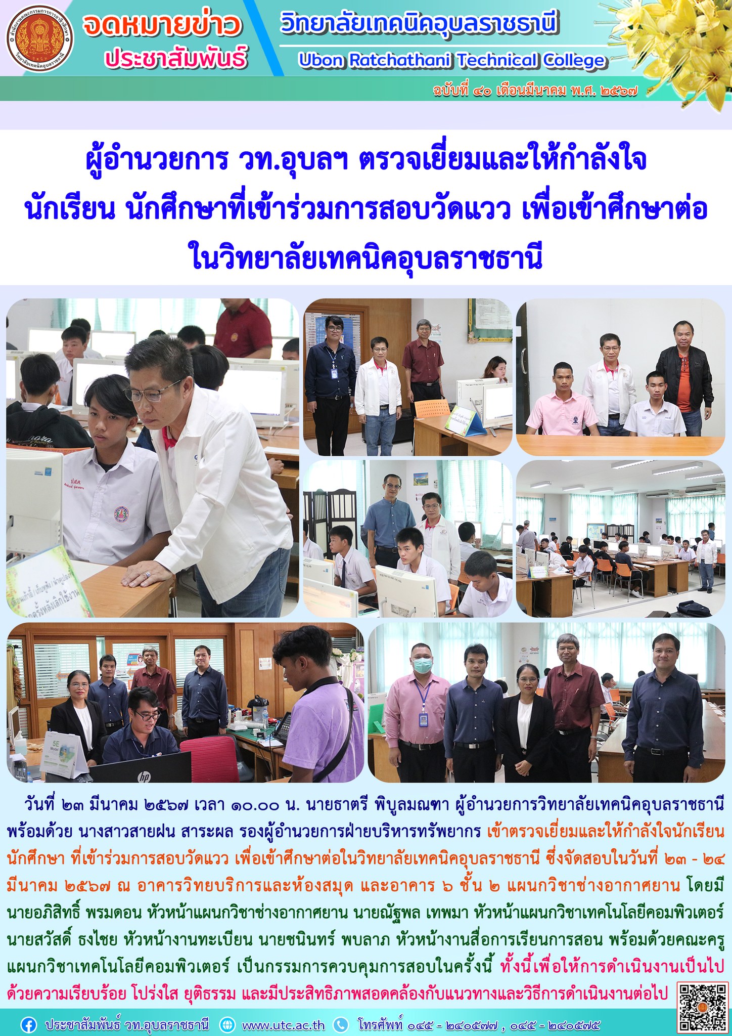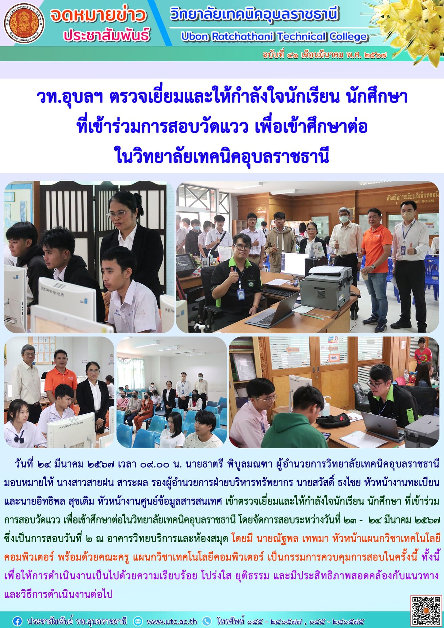 วันที่ ๒๓ มีนาคม ๒๕๖๗ ที่ผ่านมา นายธาตรี พิบูลมณฑา ผู้อำนวยการวิทยาลัยเทคนิคอุบลราชธานี มอบหมายให้ นายภาสกร ศรีขาว หัวหน้าแผนกวิชาช่างไฟฟ้ากำลัง พร้อมด้วยคณะครู (เพิ่มเติม…)