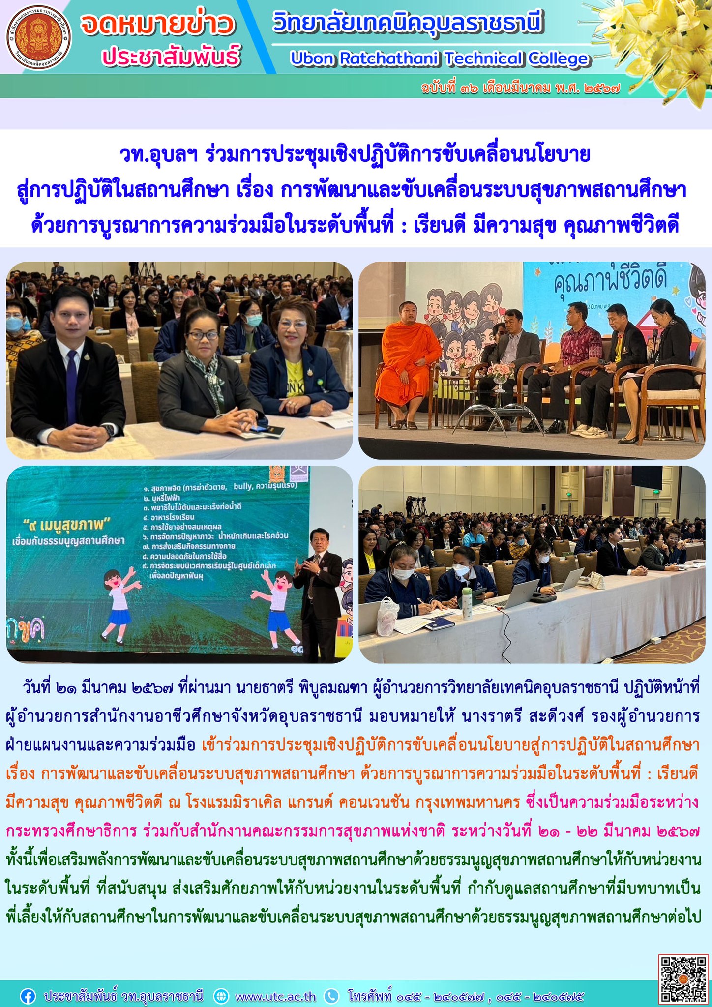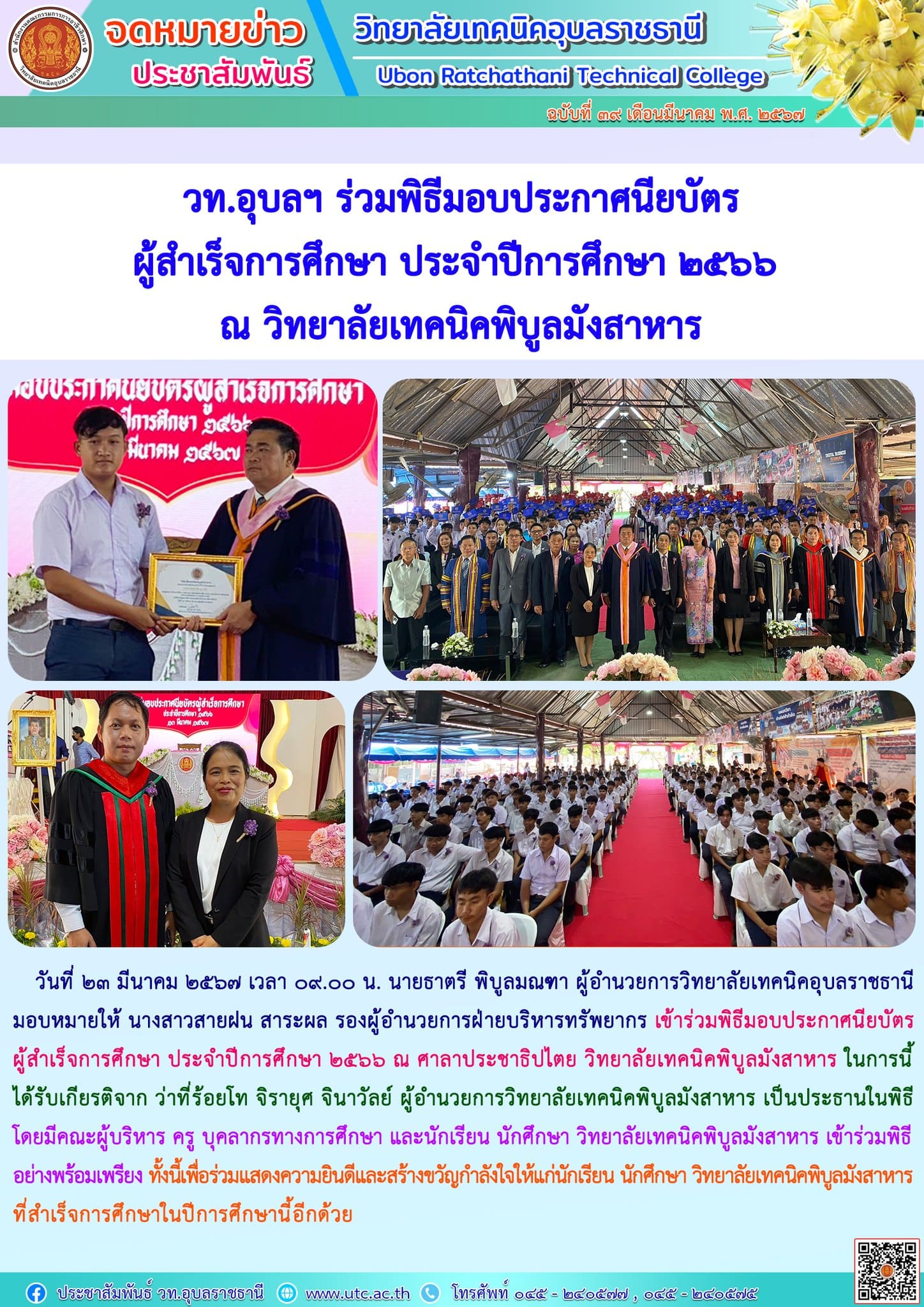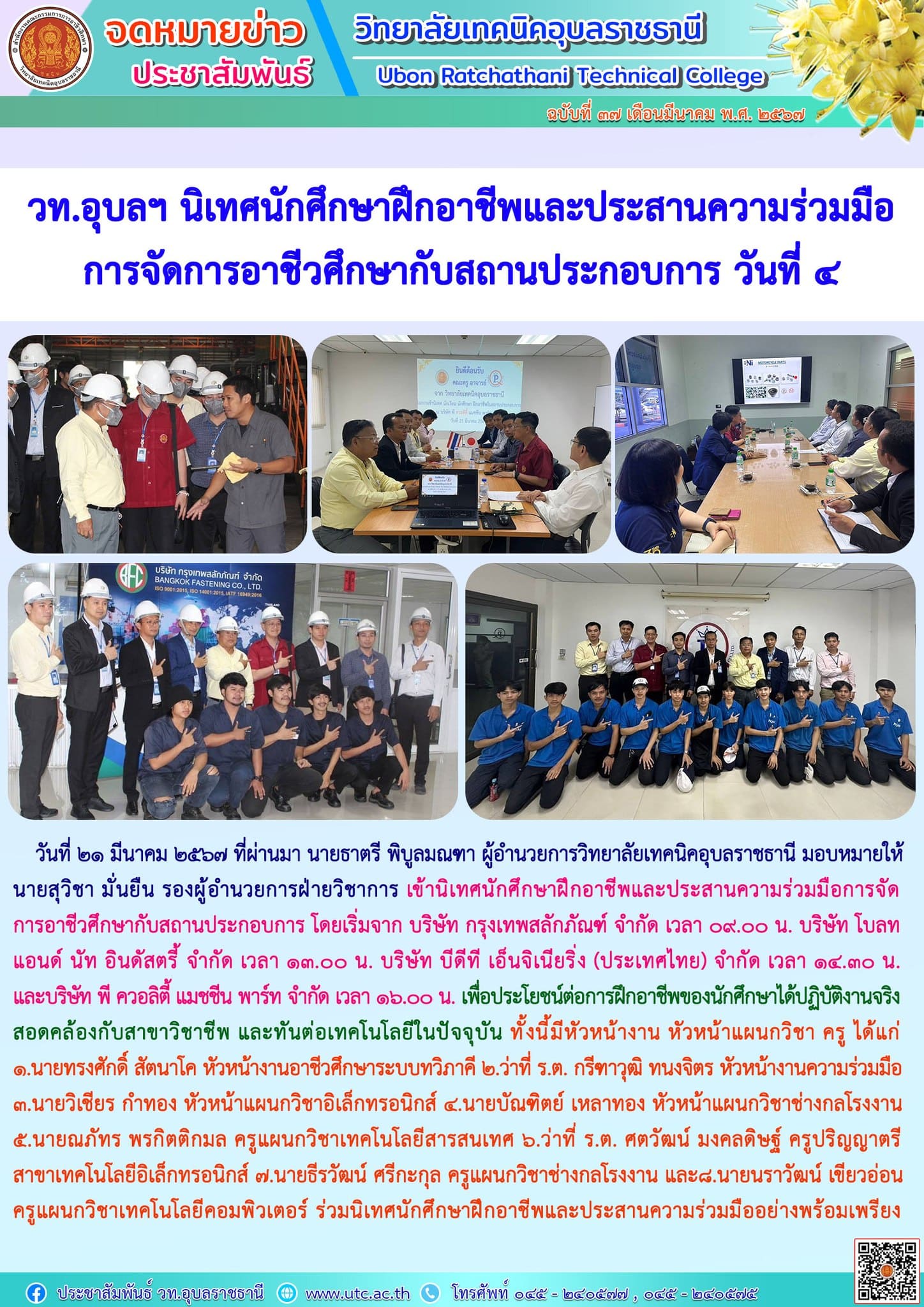 วันที่ ๒๓ มีนาคม ๒๕๖๗ ที่ผ่านมา นายธาตรี พิบูลมณฑา ผู้อำนวยการวิทยาลัยเทคนิคอุบลราชธานี มอบหมายให้ นายภาสกร ศรีขาว หัวหน้าแผนกวิชาช่างไฟฟ้ากำลัง พร้อมด้วยคณะครู (เพิ่มเติม…)