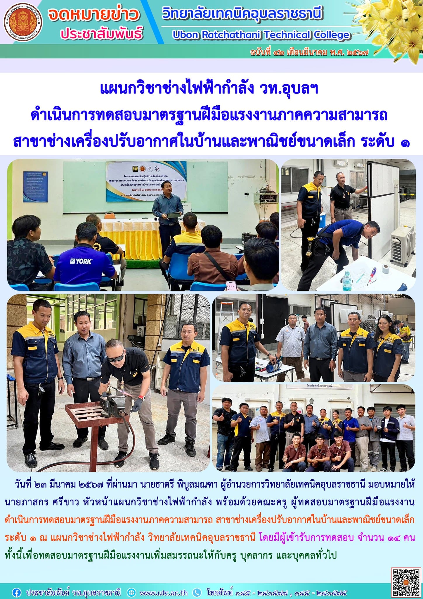 แผนกวิชาช่างไฟฟ้ากำลัง วท.อุบลฯ ดำเนินทดสอบมาตรฐานฝีมือแรงงานภาคความสามารถ สาขาช่างเครื่องปรับอากาศในบ้านและพาณิชย์ขนาดเล็ก ระดับ ๑