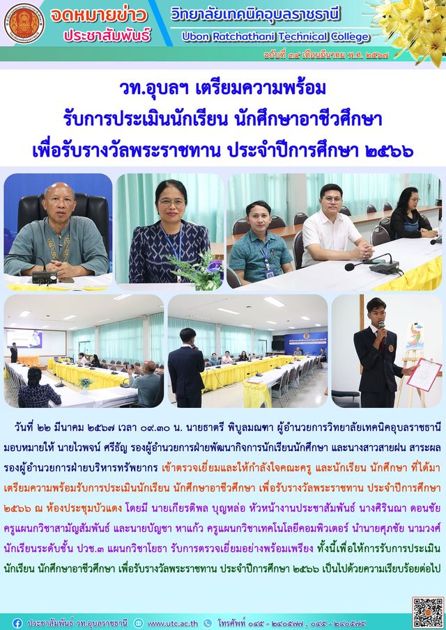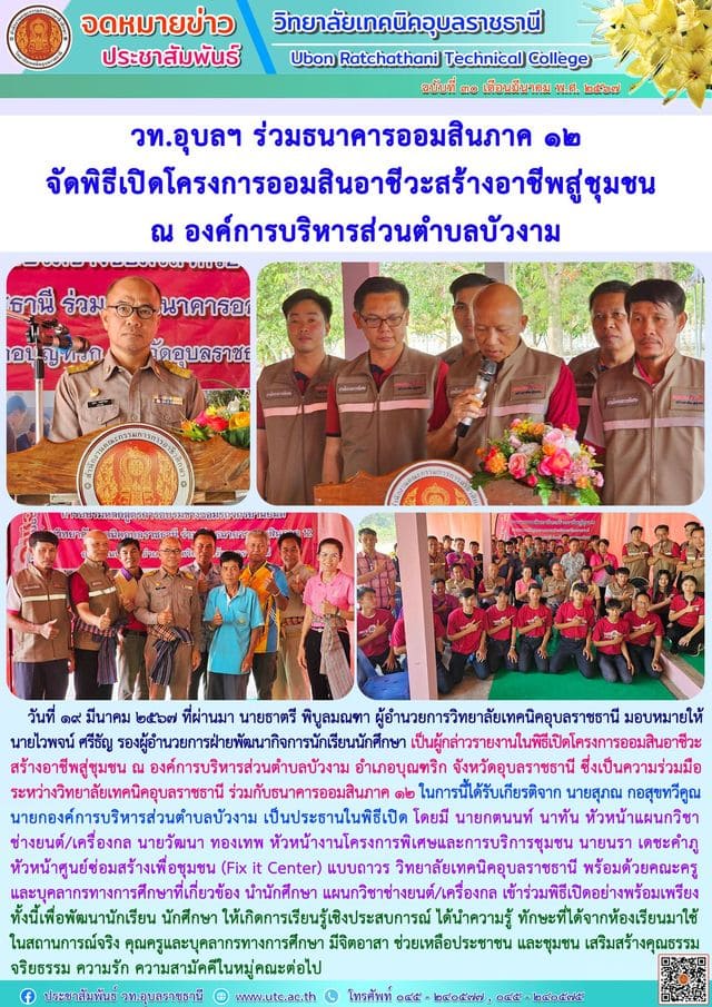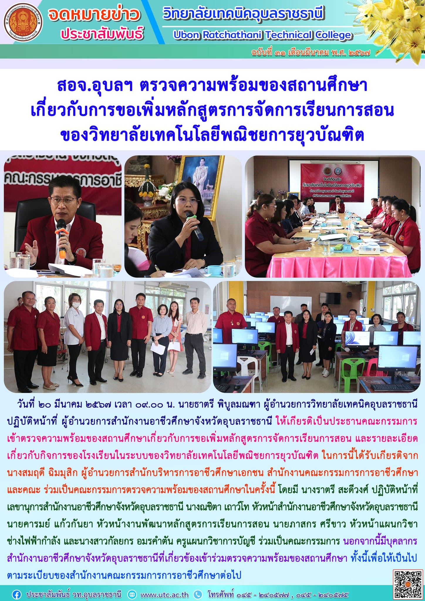 วันที่ ๑๙ มีนาคม ๒๕๖๗ ที่ผ่านมา นายธาตรี พิบูลมณฑา ผู้อำนวยการวิทยาลัยเทคนิคอุบลราชธานี มอบหมายให้ นายสุวิชา มั่นยืน รองผู้อำนวยการฝ่ายวิชาการ เข้านิเทศนักศึกษาฝึกอาชีพและประสานความร่วมมือ (เพิ่มเติม…)