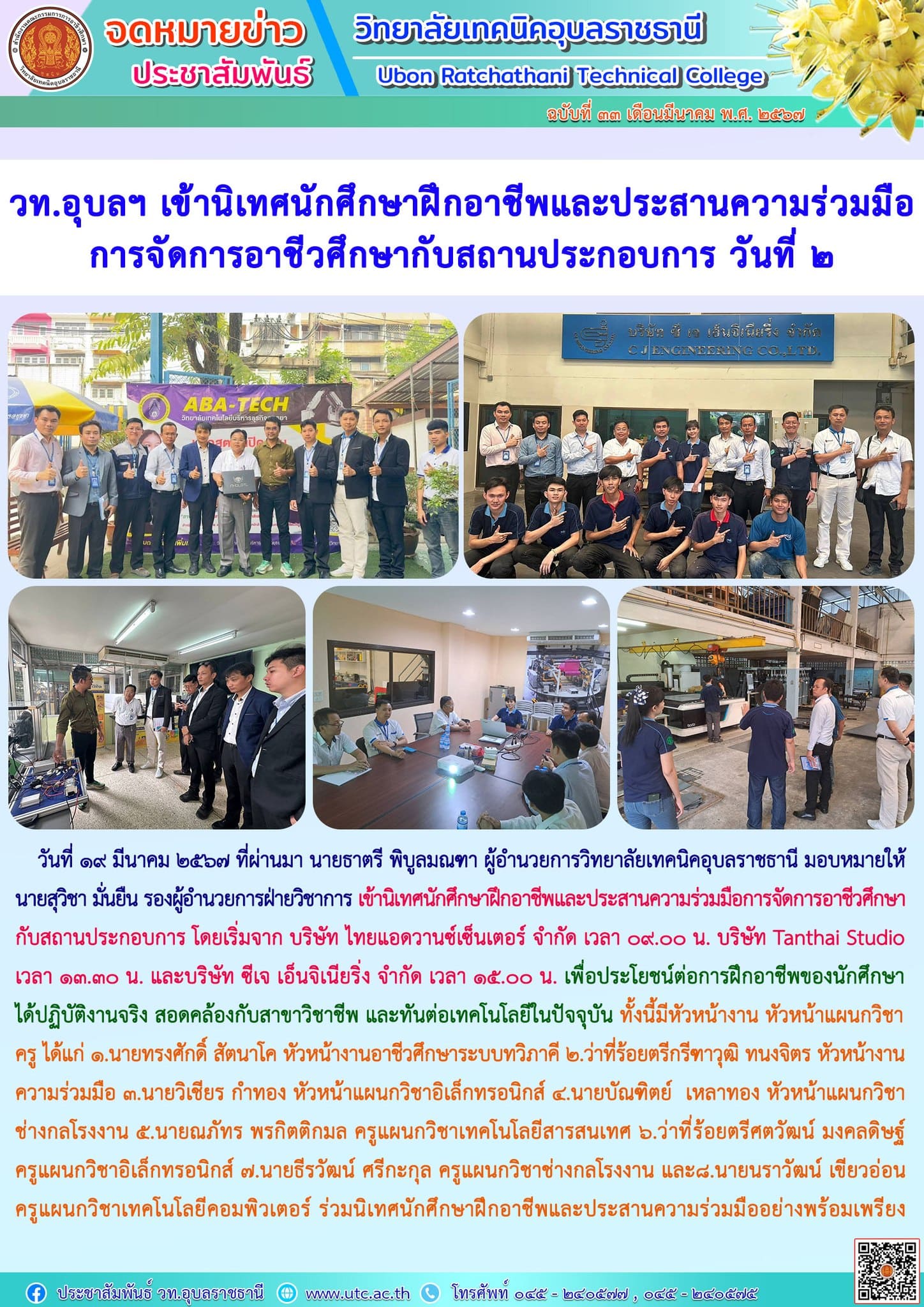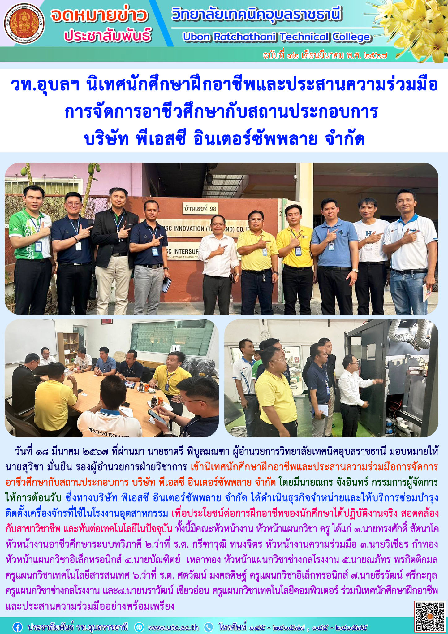 วท.อุบลฯ เข้านิเทศนักศึกษาฝึกอาชีพและประสานความร่วมมือการจัดการอาชีวศึกษากับสถานประกอบการ วันที่ ๒