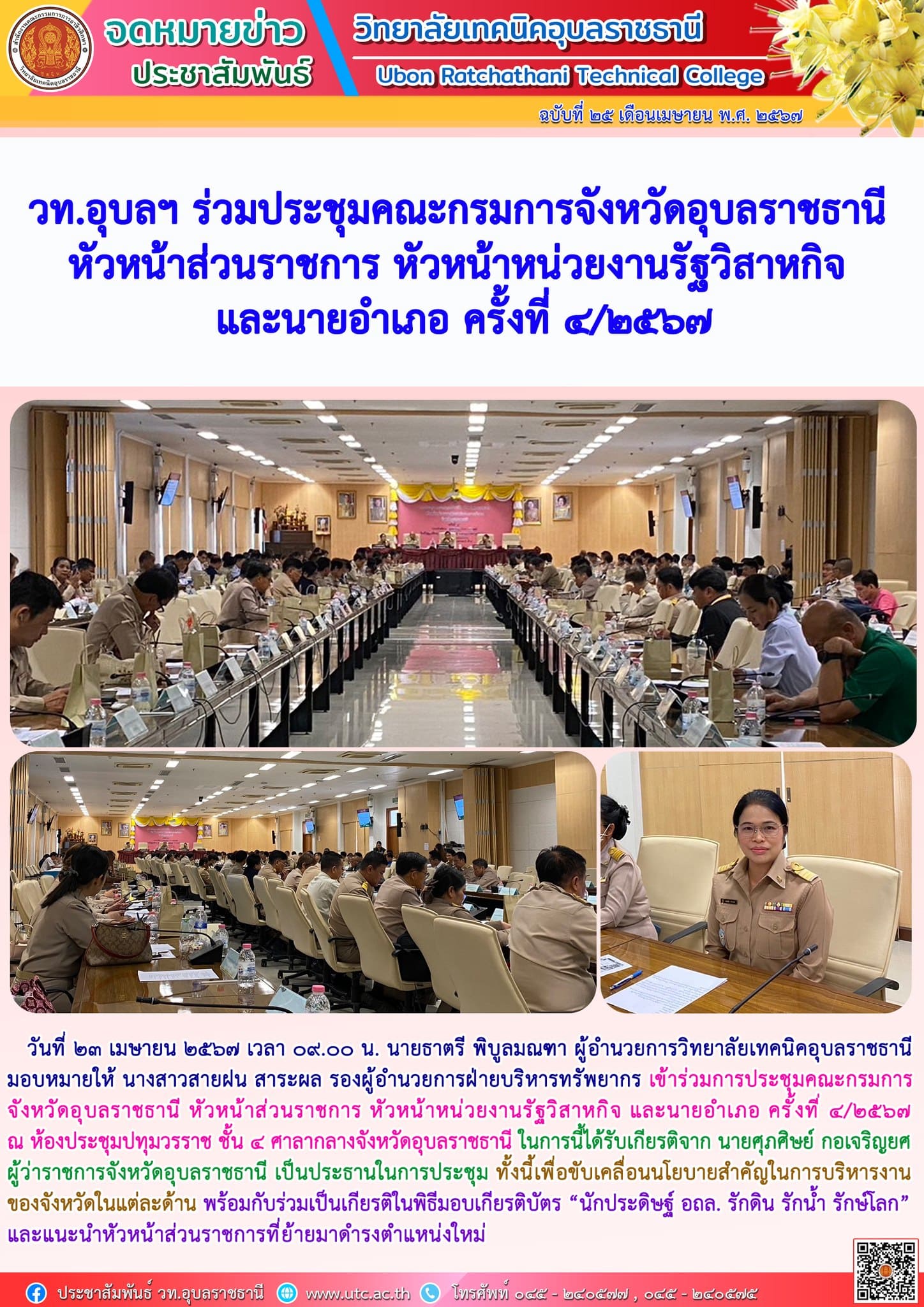 วันที่ ๒๔ เมษายน ๒๕๖๗ เวลา ๐๗.๐๐ น. นายธาตรี พิบูลมณฑา ผู้อำนวยการวิทยาลัยเทคนิคอุบลราชธานี ได้มอบหมายให้ นายไวพจน์ ศรีธัญ รองผู้อำนวยการฝ่ายพัฒนากิจการนักเรียนนักศึกษา เข้าร่วมการประชุม (เพิ่มเติม…)