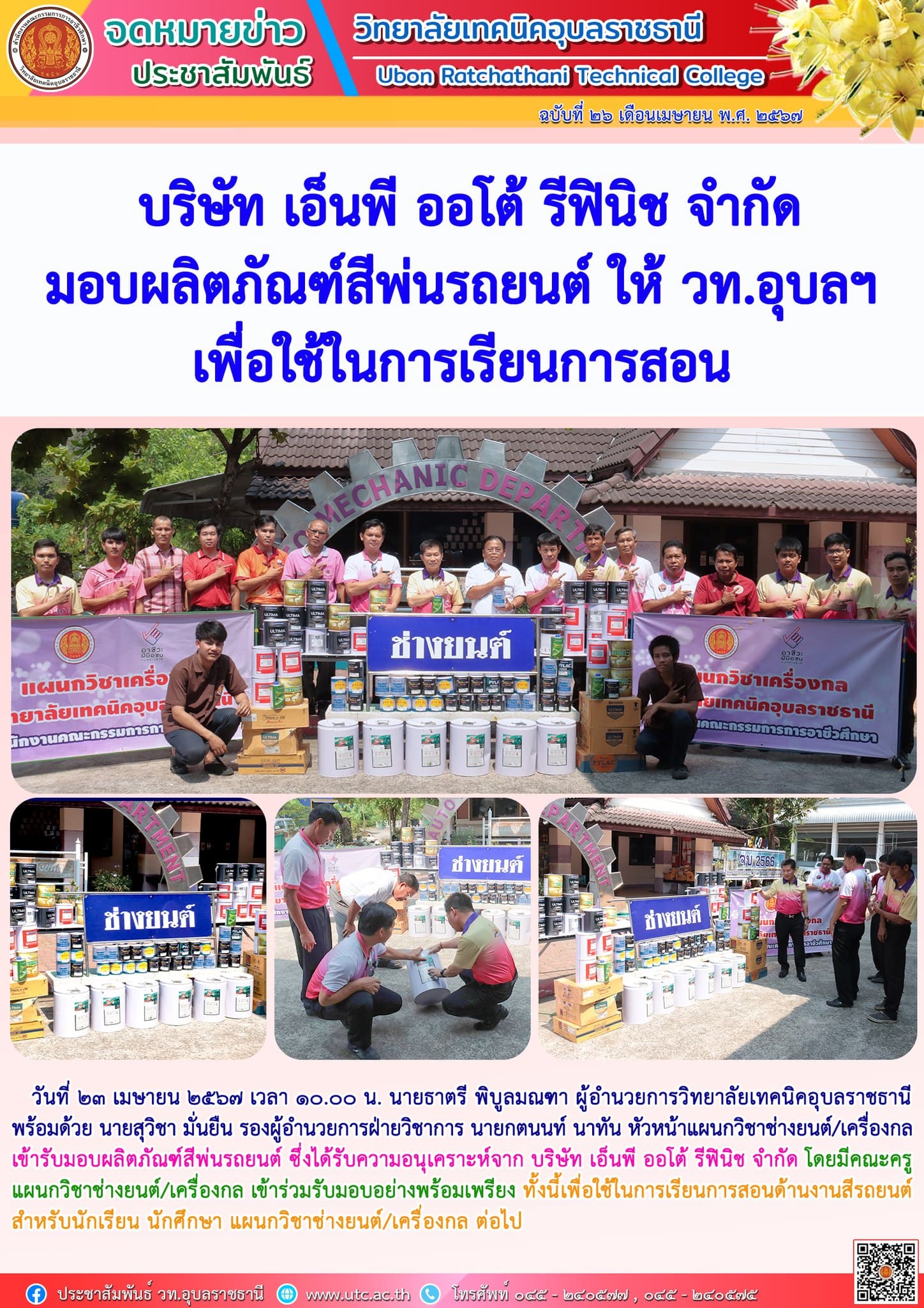 วันที่ ๒๓ เมษายน ๒๕๖๗ เวลา ๑๐.๐๐ น. นายธาตรี พิบูลมณฑา ผู้อำนวยการวิทยาลัยเทคนิคอุบลราชธานี พร้อมด้วย นายสุวิชา มั่นยืน รองผู้อำนวยการฝ่ายวิชาการ นายกตนนท์ นาทัน (เพิ่มเติม…)