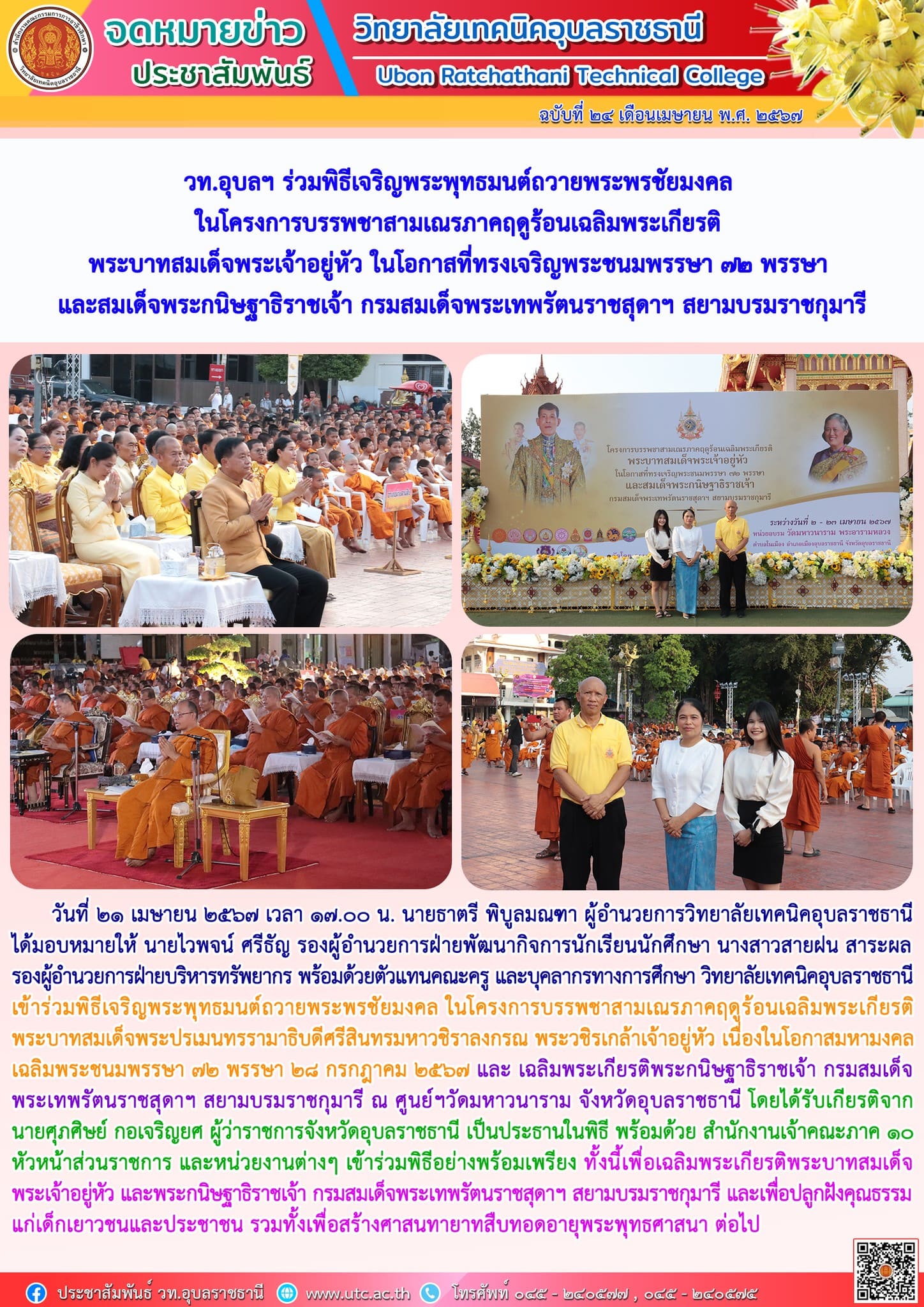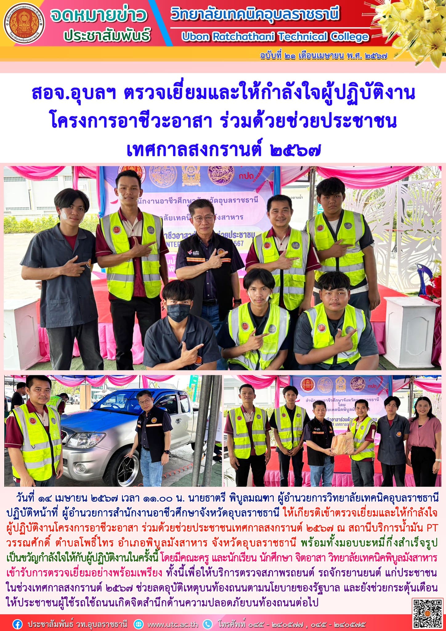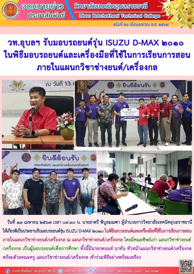 วันที่ ๑๓ เมษายน ๒๕๖๗ เวลา ๐๙.๓๐ น. นายธาตรี พิบูลมณฑา ผู้อำนวยการวิทยาลัยเทคนิคอุบลราชธานี (เพิ่มเติม…)