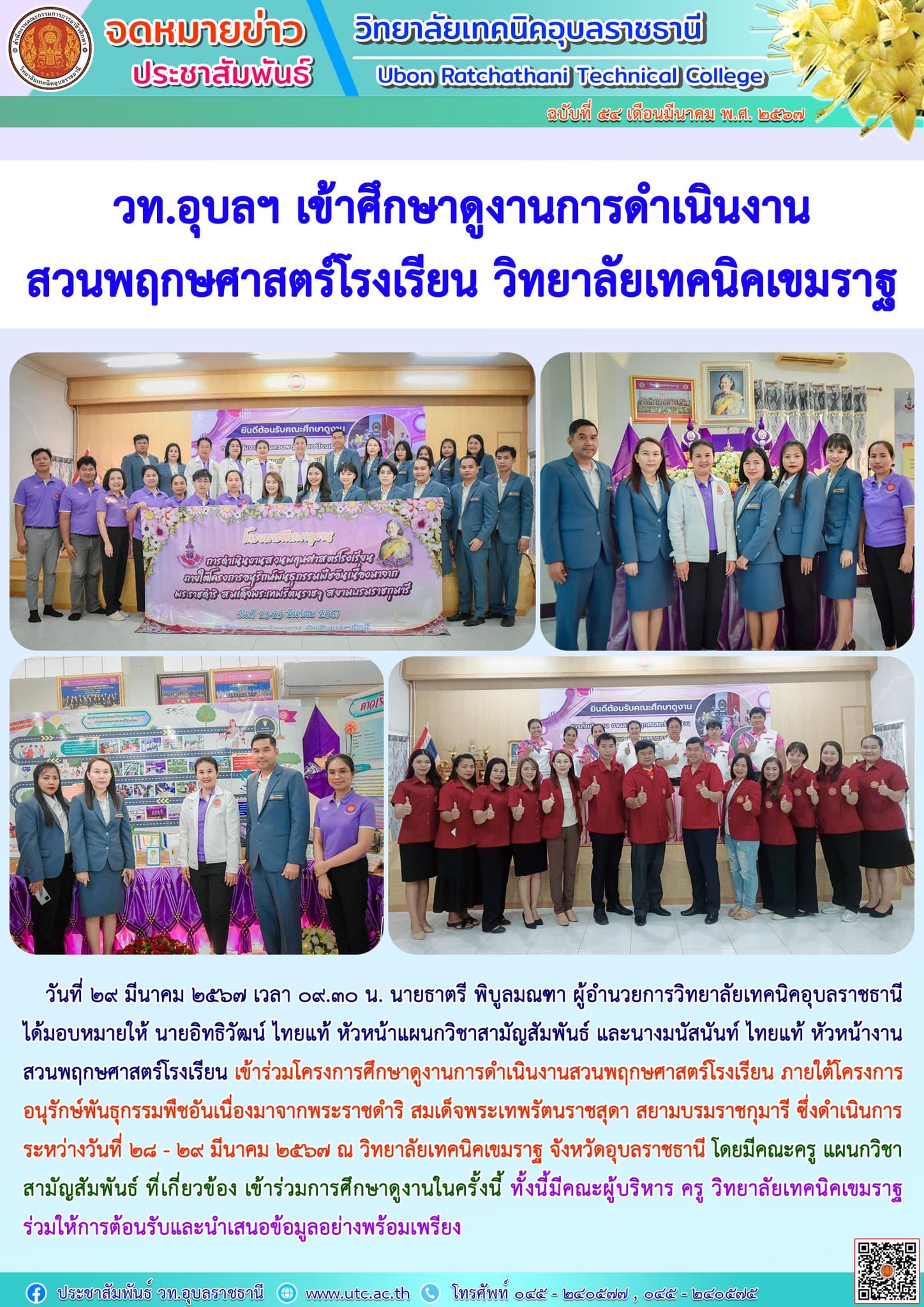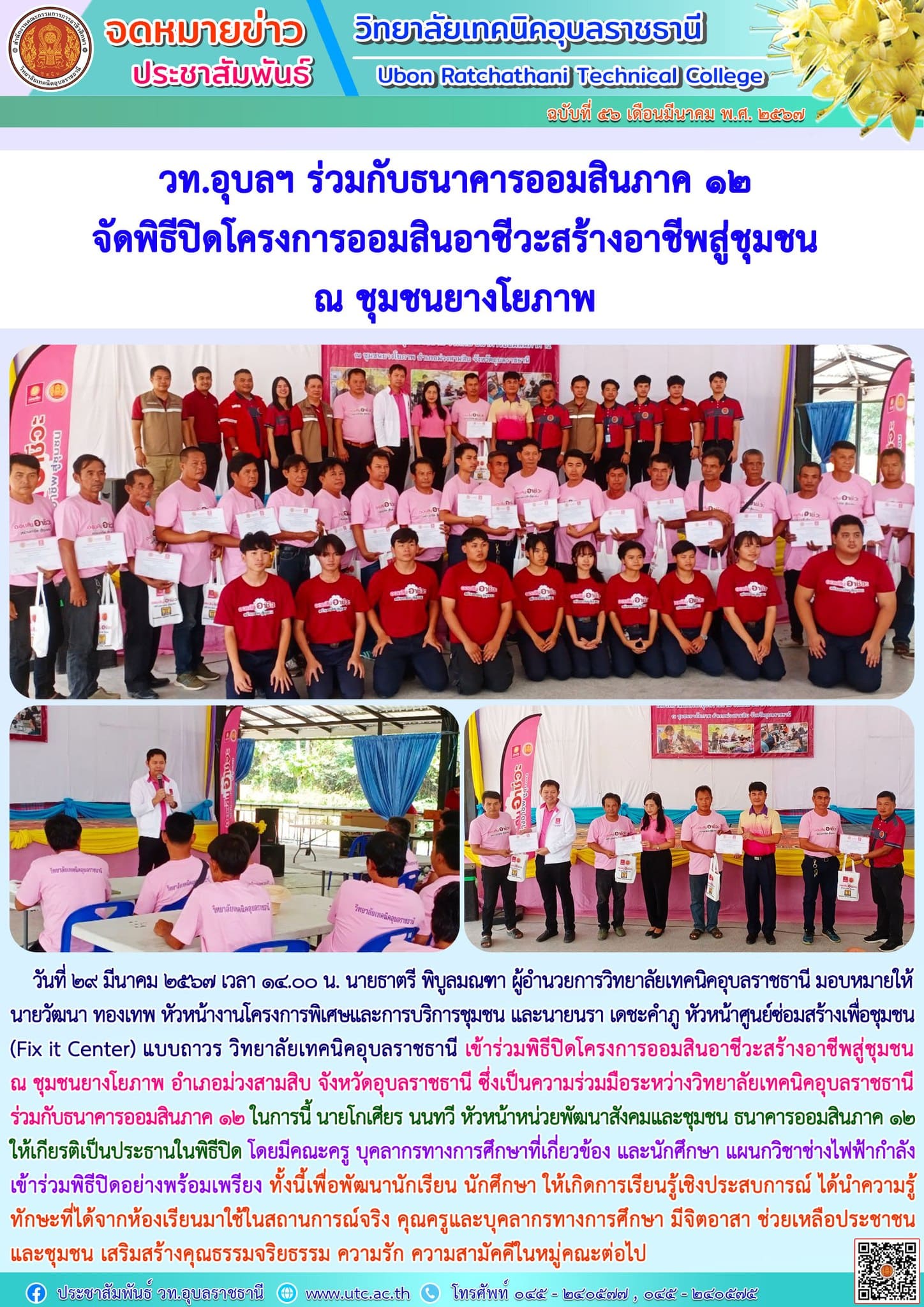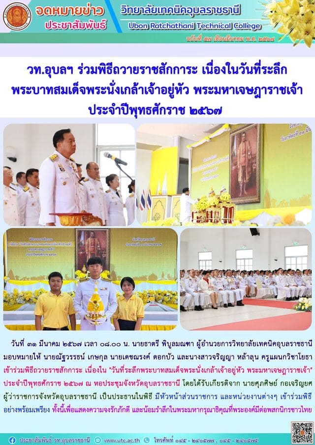 วันที่ ๓๑ มีนาคม ๒๕๖๗ เวลา ๐๘.๐๐ น. นายธาตรี พิบูลมณฑา ผู้อำนวยการวิทยาลัยเทคนิคอุบลราชธานี (เพิ่มเติม…)