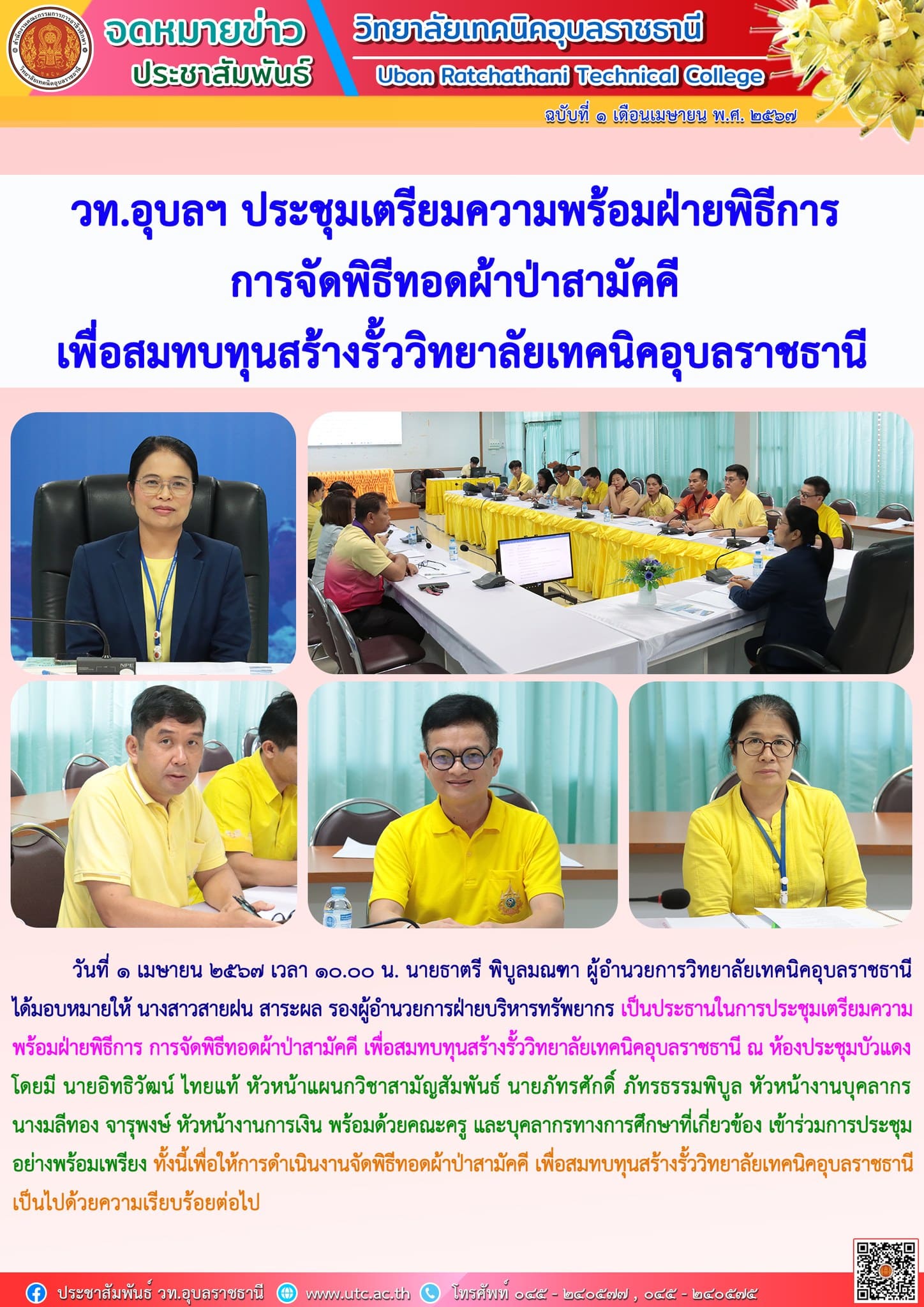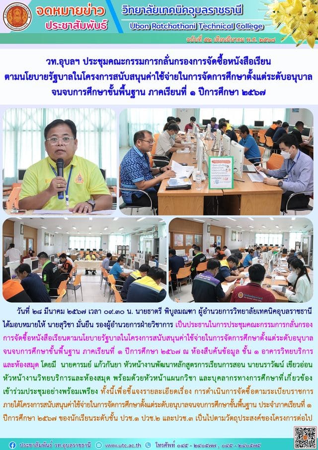 วันที่ ๑ เมษายน ๒๕๖๗ เวลา ๑๐.๐๐ น. นายธาตรี พิบูลมณฑา ผู้อำนวยการวิทยาลัยเทคนิคอุบลราชธานี ได้มอบหมายให้ นางสาวสายฝน (เพิ่มเติม…)