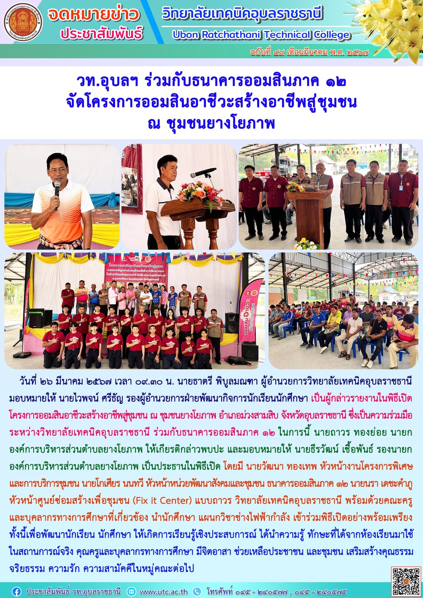วันที่ ๒๗ มีนาคม ๒๕๖๗ เวลา ๐๘.๓๐ น. นายธาตรี พิบูลมณฑา ผู้อำนวยการวิทยาลัยเทคนิคอุบลราชธานี (เพิ่มเติม…)