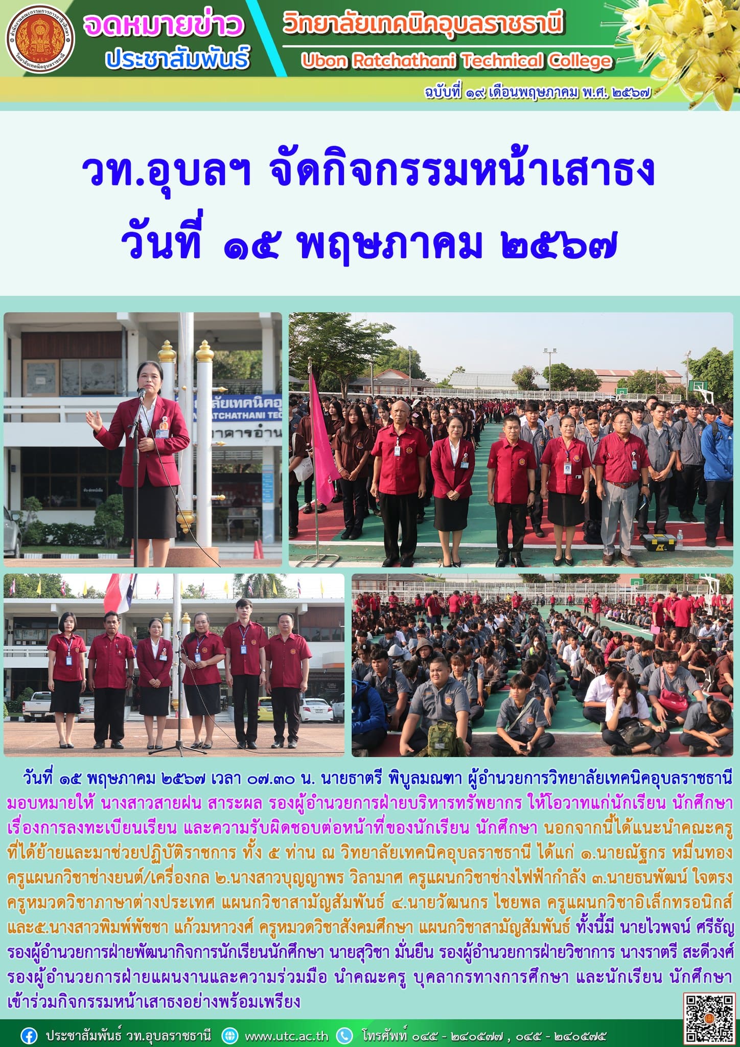 วันที่ ๑๕ พฤษภาคม ๒๕๖๗ เวลา ๐๗.๓๐ น. นายธาตรี พิบูลมณฑา ผู้อำนวยการวิทยาลัยเทคนิคอุบลราชธานี มอบหมายให้ นางสาวสายฝน สาระผล รองผู้อำนวยการฝ่าย (เพิ่มเติม…)