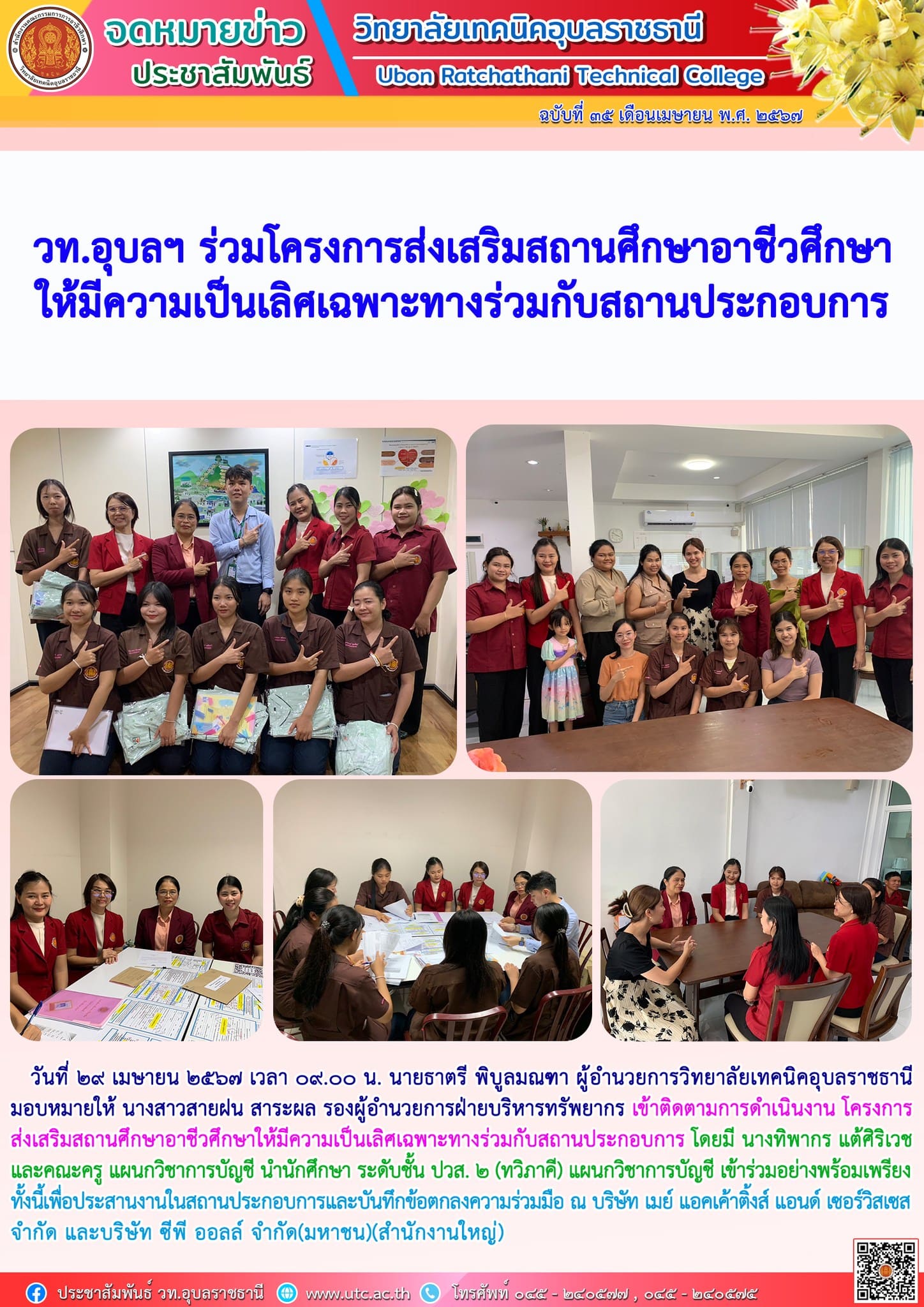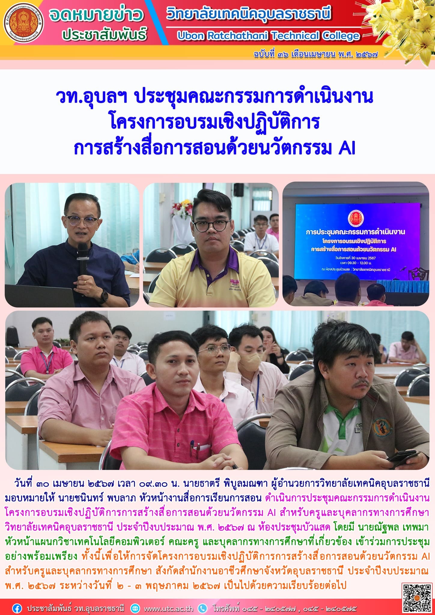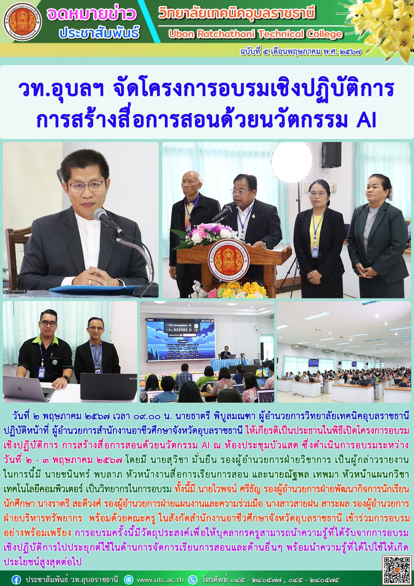 วันที่ ๑ พฤษภาคม ๒๕๖๗ เวลา ๐๘.๓๐ น. นายธาตรี พิบูลมณฑา ผู้อำนวยการวิทยาลัยเทคนิคอุบลราชธานี พร้อมด้วยนางสาวสายฝน สาระผล (เพิ่มเติม…)