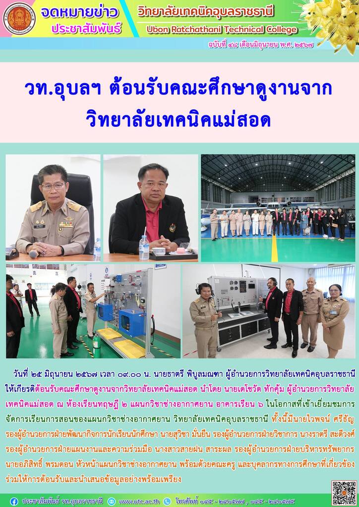 วันที่ ๒๕ มิถุนายน ๒๕๖๗ เวลา ๐๙.๐๐ น. นายธาตรี พิบูลมณฑา ผู้อำนวยการวิทยาลัยเทคนิคอุบลราชธานี ให้เกียรติต้อนรับคณะศึกษาดูงานจากวิทยาลัยเทคนิคแม่สอด นำโดย (เพิ่มเติม…)