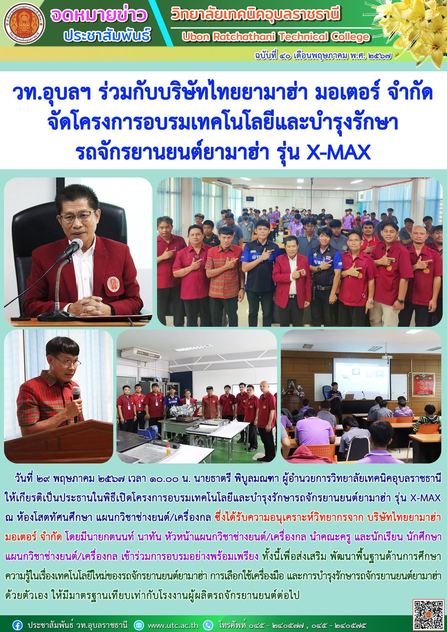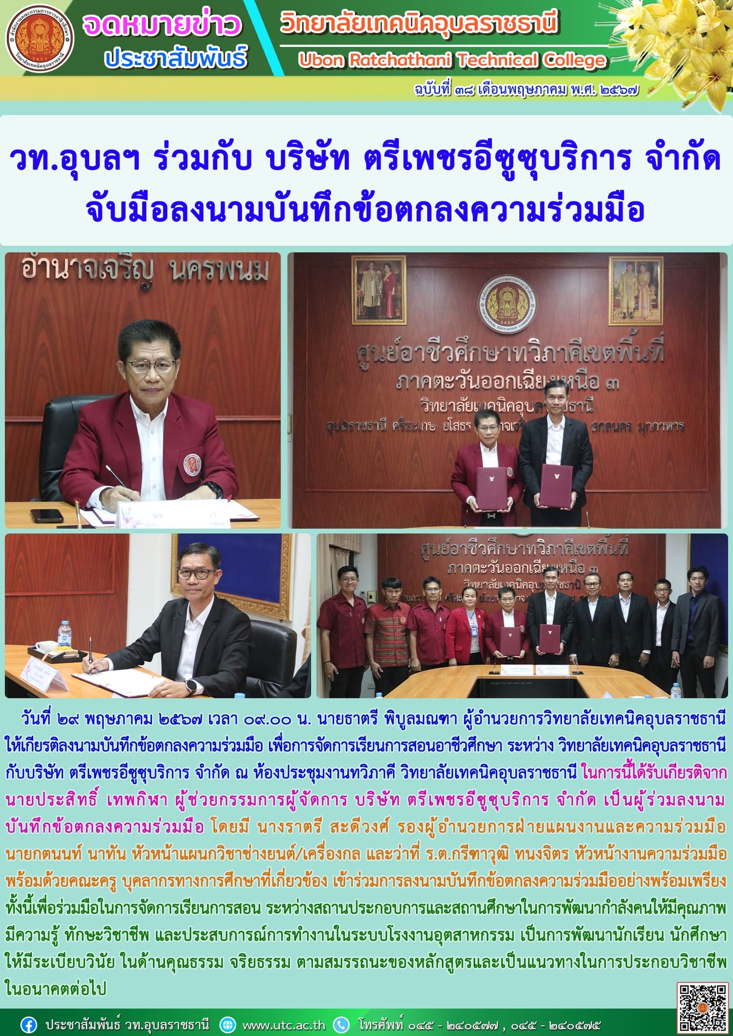 วันที่ ๒๙ พฤษภาคม ๒๕๖๗ เวลา ๐๙.๐๐ น. นายธาตรี พิบูลมณฑา ผู้อำนวยการวิทยาลัยเทคนิคอุบลราชธานี ให้เกียรติลงนามบันทึกข้อตกลงความร่วมมือ เพื่อการจัดการ (เพิ่มเติม…)