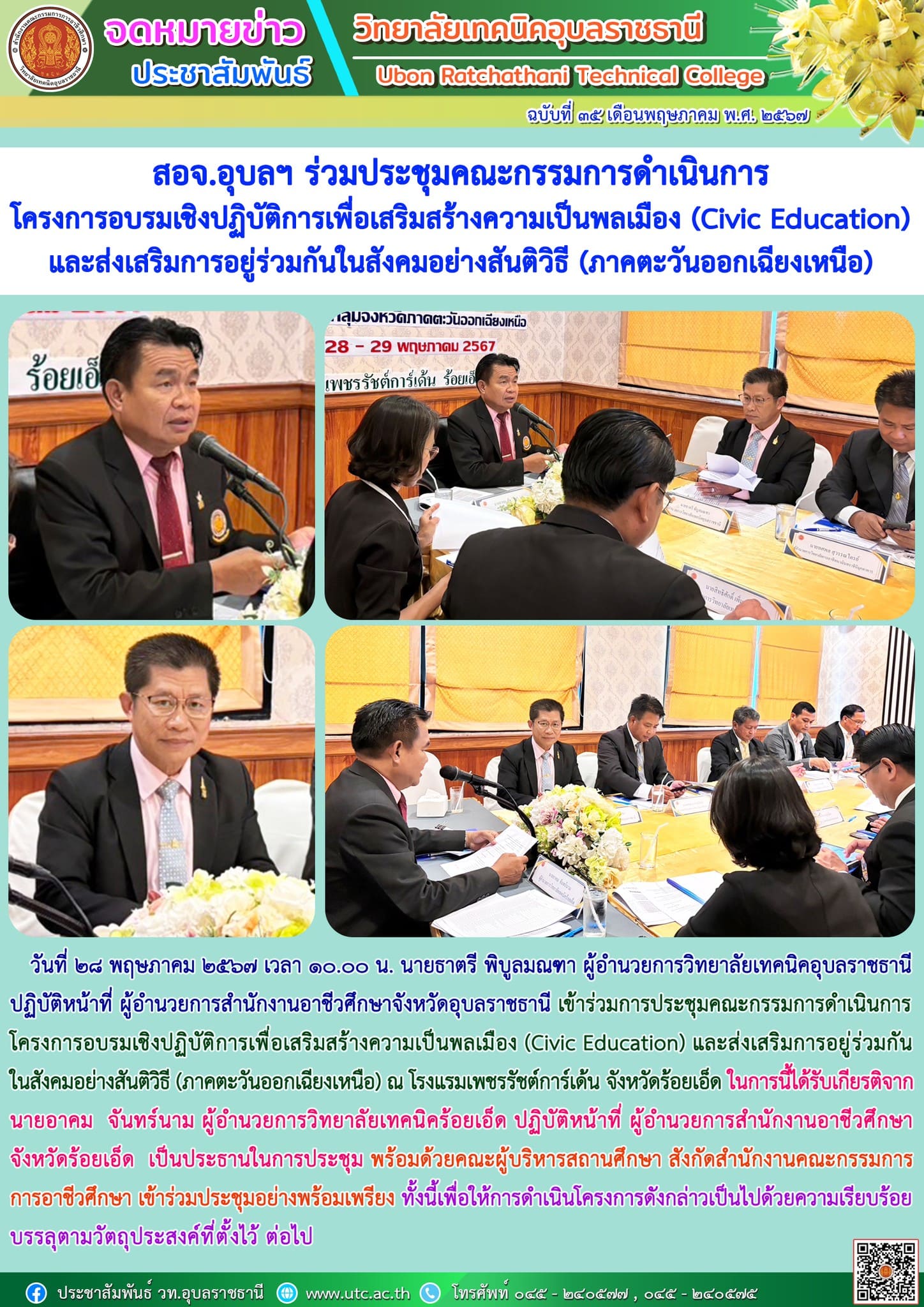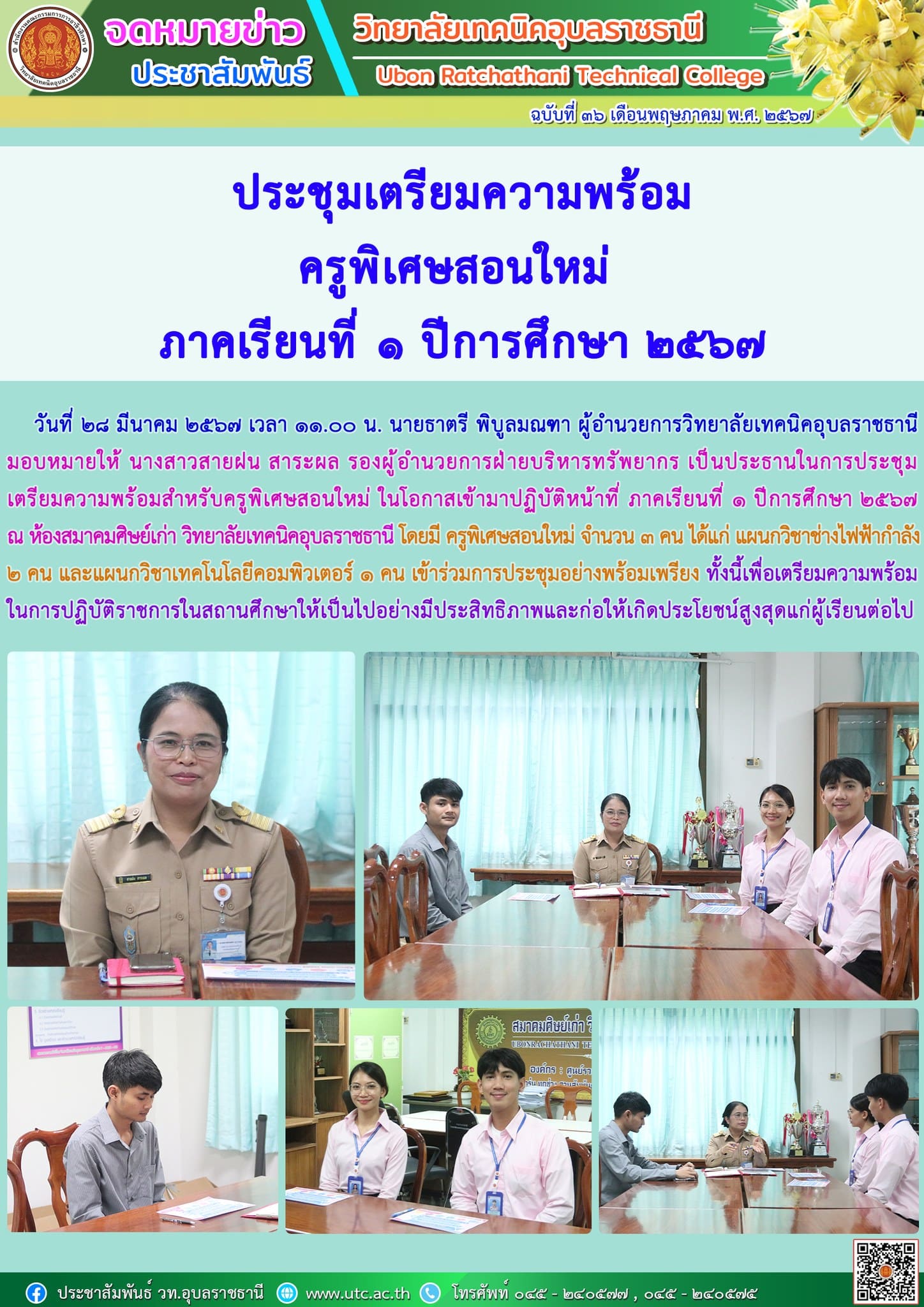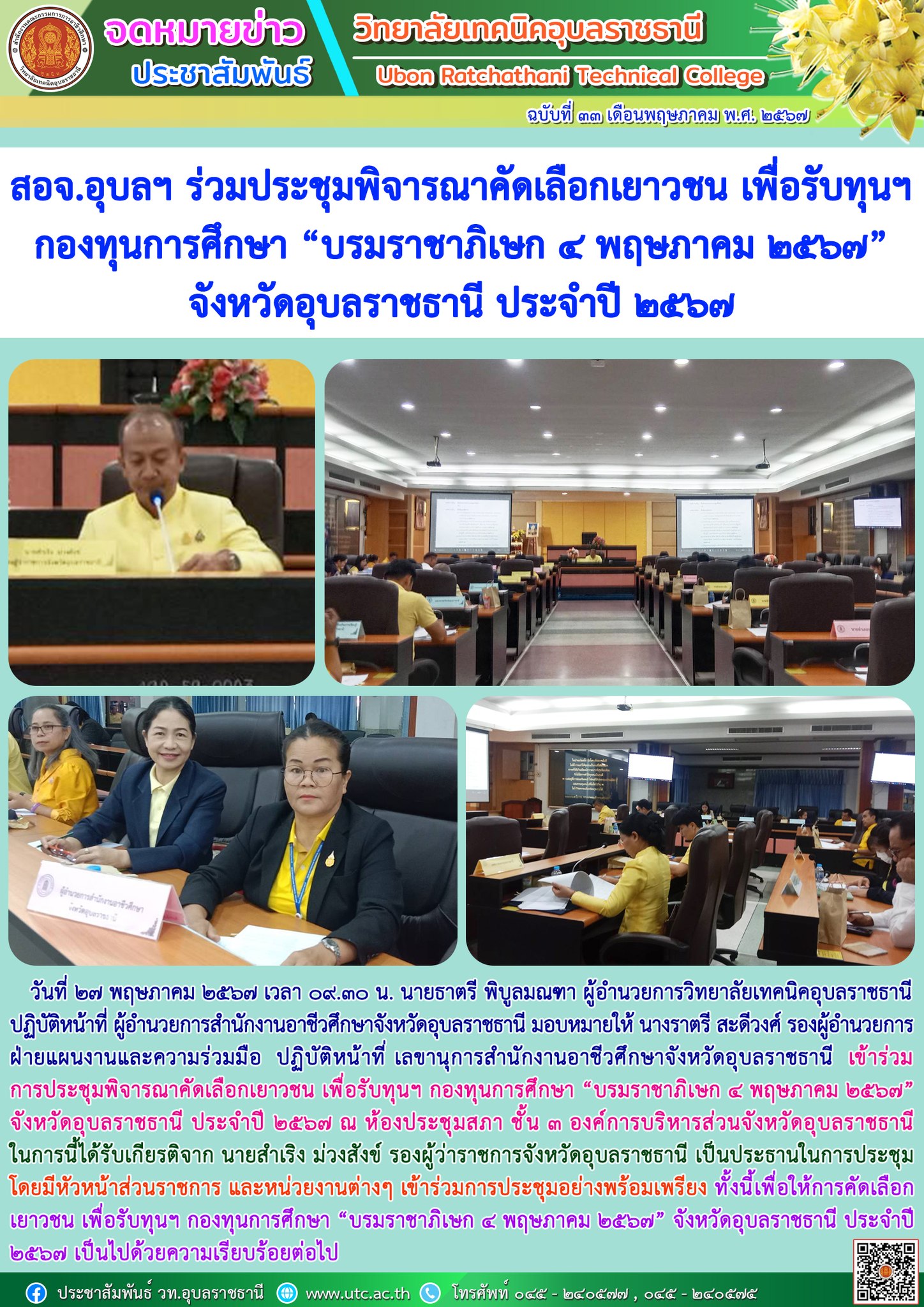 วันที่ ๒๗ พฤษภาคม ๒๕๖๗ เวลา ๐๙.๓๐ น. นายธาตรี พิบูลมณฑา ผู้อำนวยการวิทยาลัยเทคนิคอุบลราชธานี ปฏิบัติหน้าที่ ผู้อำนวยการ (เพิ่มเติม…)