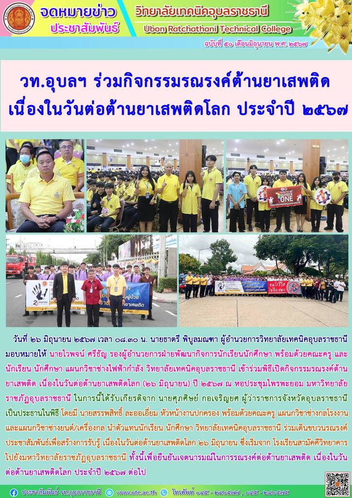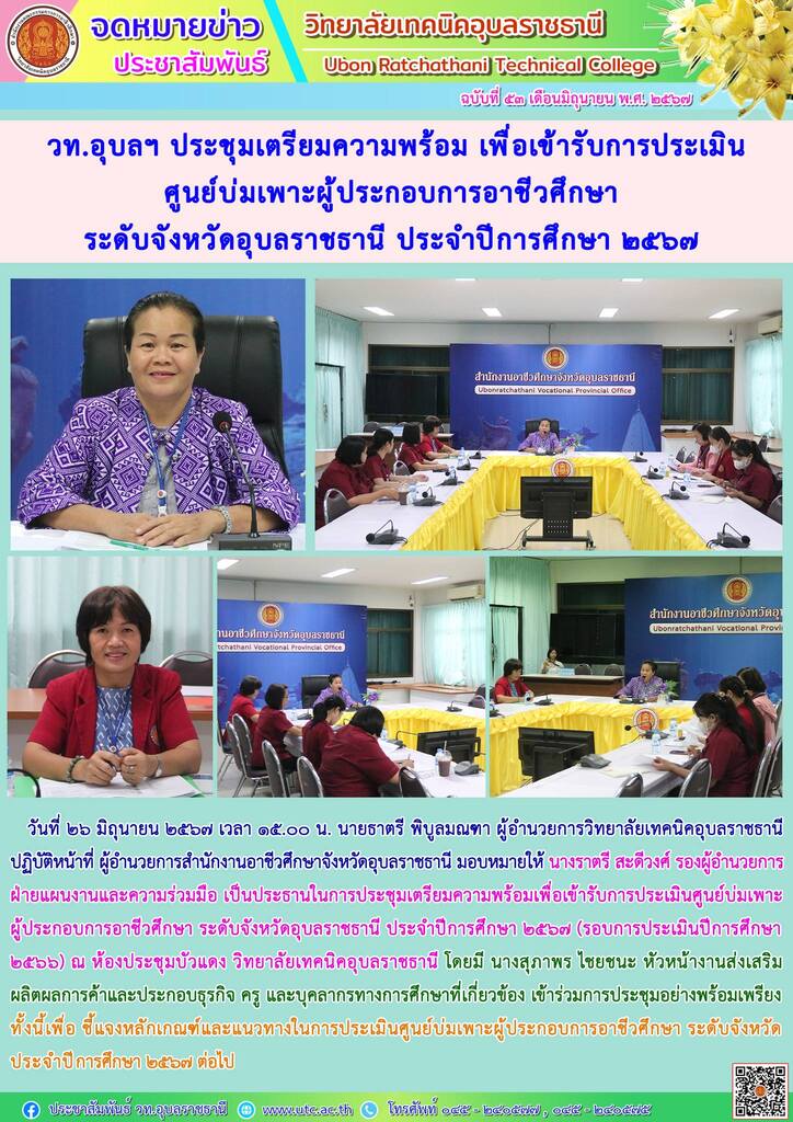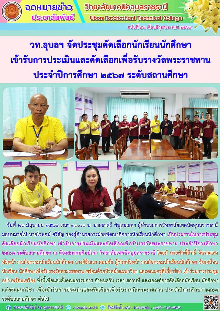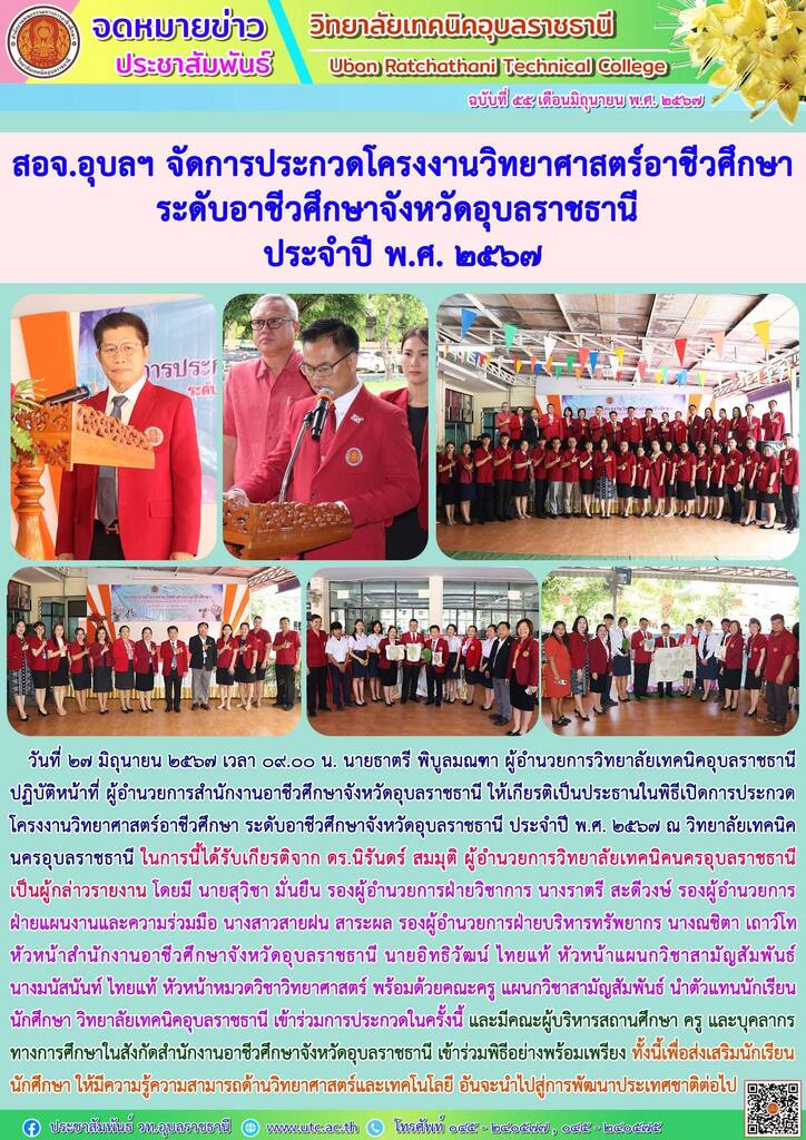 วันที่ ๒๖ มิถุนายน ๒๕๖๗ เวลา ๑๕.๐๐ น. นายธาตรี พิบูลมณฑา ผู้อำนวยการวิทยาลัยเทคนิคอุบลราชธานี (เพิ่มเติม…)