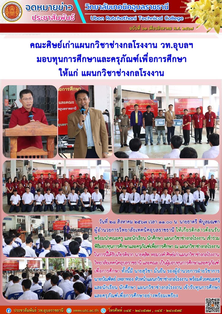 วันที่ ๒๘ สิงหาคม ๒๕๖๗ เวลา ๑๑.๐๐ น. นายธาตรี พิบูลมณฑา ผู้อำนวยการวิทยาลัยเทคนิคอุบลราชธานี ให้เกียรติกล่าวต้อนรับ พร้อมนำคณะครู และนักเรียน นักศึกษา แผนกวิชาช่างกลโรงงาน เข้าร่วมพิธีมอบทุนการศึกษาและครุภัณฑ์เพื่อการศึกษา ณ (เพิ่มเติม…)