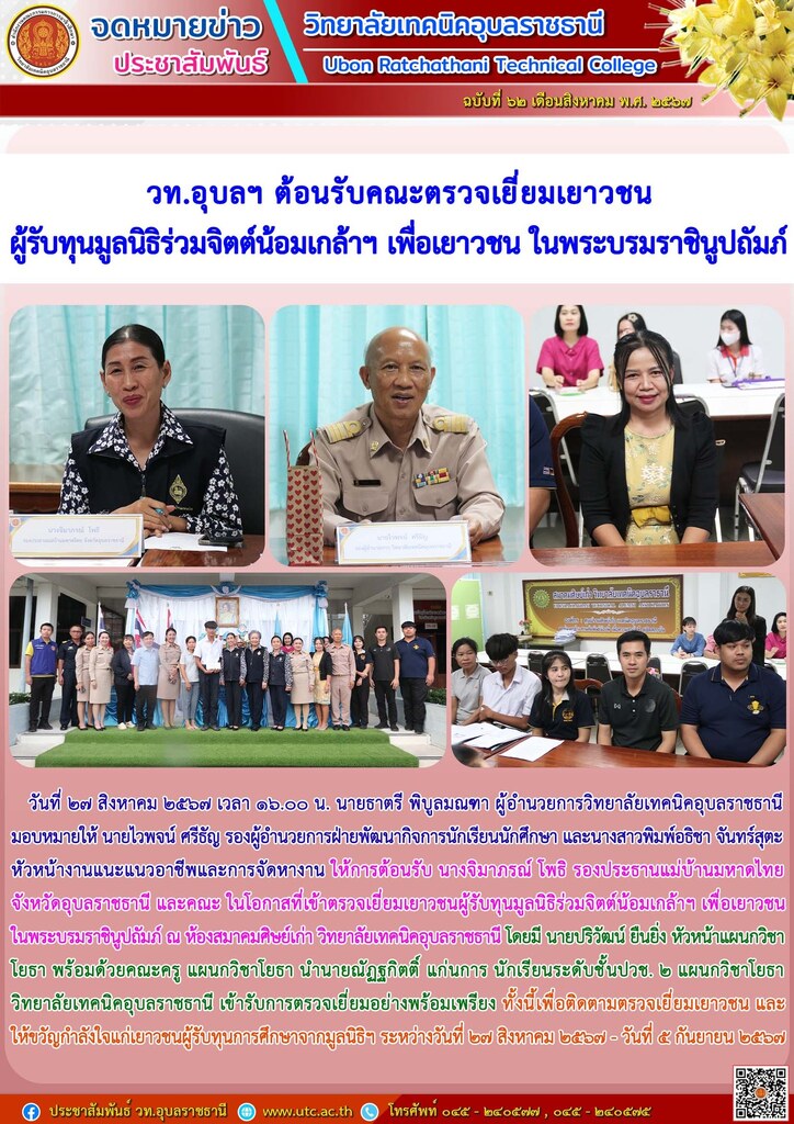 วันที่ ๒๗ สิงหาคม ๒๕๖๗ เวลา ๑๔.๐๐ น. นายธาตรี พิบูลมณฑา ผู้อำนวยการวิทยาลัยเทคนิคอุบลราชธานี มอบหมายให้ นางสาวธิดารัตน์ บุญดล หัวหน้างานครูที่ปรึกษาและนางสาว (เพิ่มเติม…)