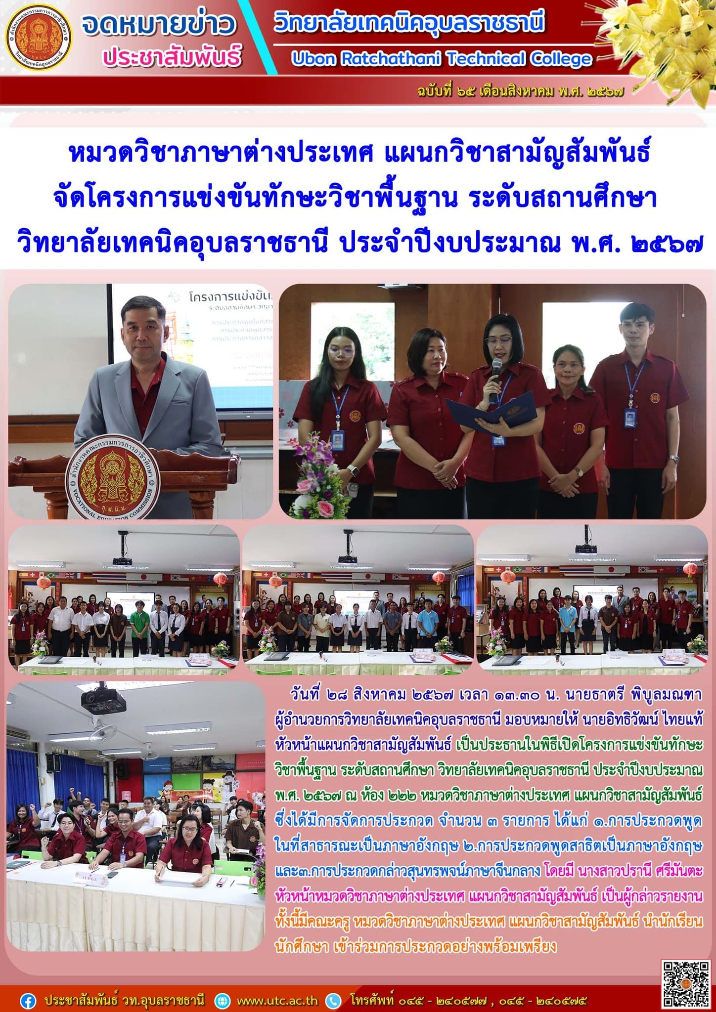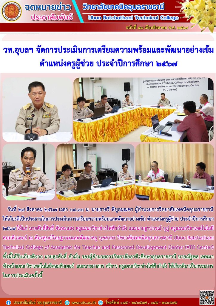วันที่ ๒๗ สิงหาคม ๒๕๖๗ เวลา ๐๙.๓๐ น. นายธาตรี พิบูลมณฑา ผู้อำนวยการวิทยาลัยเทคนิคอุบลราชธานี ให้เกียรติเป็นประธานในการประเมินการเตรียมความพร้อมและพัฒนา (เพิ่มเติม…)