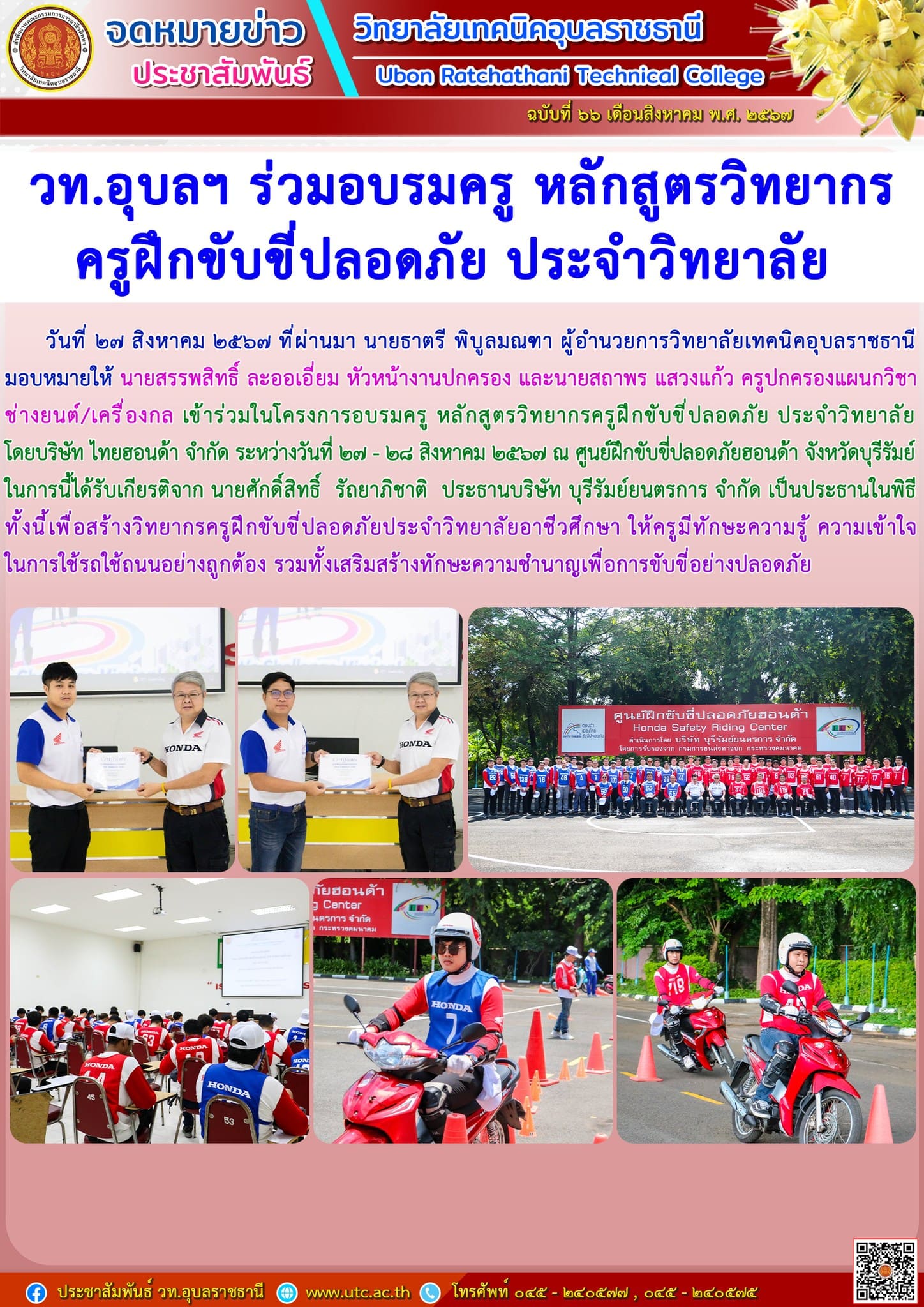 วท.อุบลฯ เข้าร่วมในโครงการอบรมครู หลักสูตรวิทยากรครูฝึกขับขี่ปลอดภัย ประจำวิทยาลัย