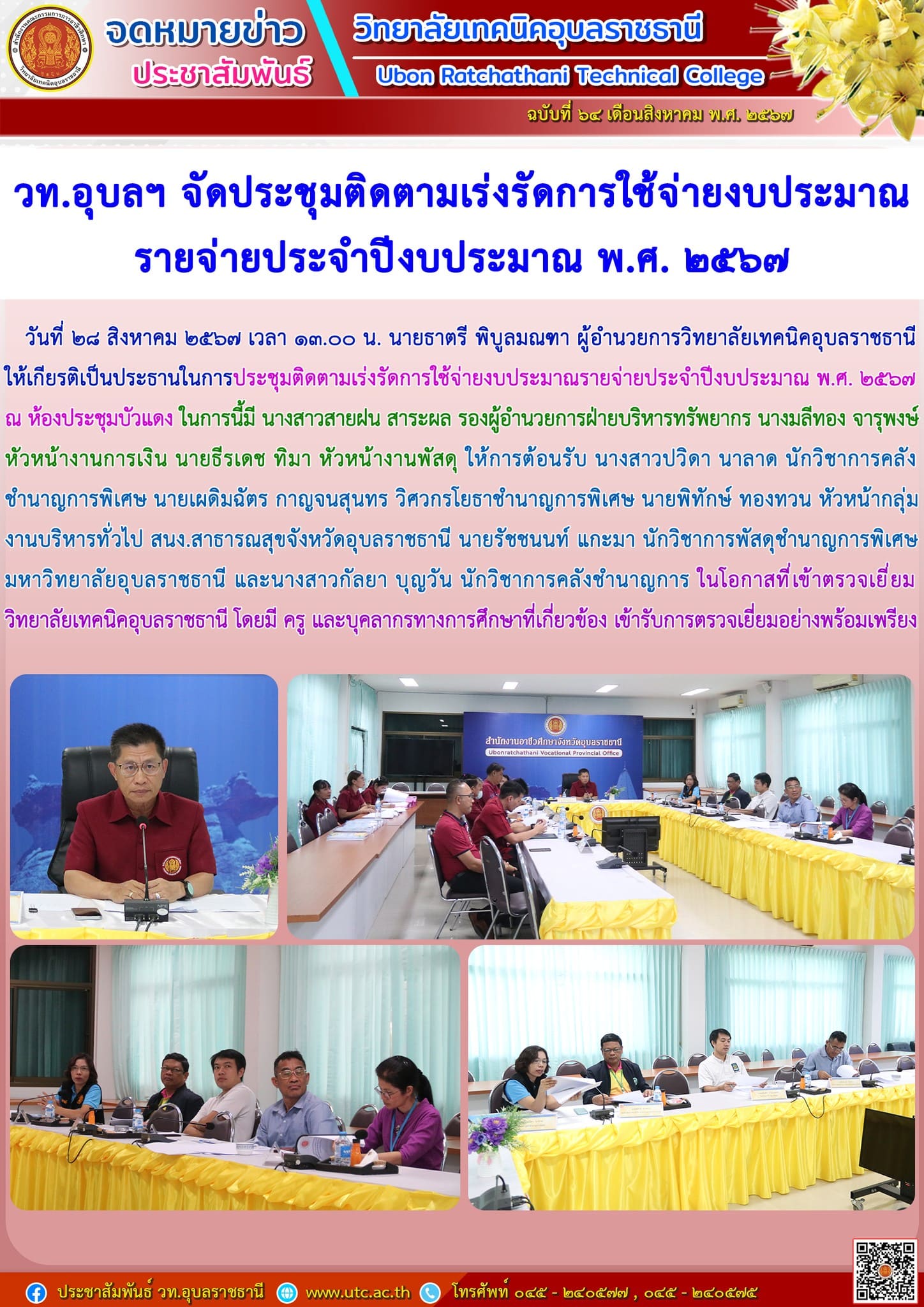วันที่ ๒๘ สิงหาคม ๒๕๖๗ เวลา ๑๓.๐๐ น. นายธาตรี พิบูลมณฑา ผู้อำนวยการวิทยาลัยเทคนิคอุบลราชธานี ให้เกียรติเป็นประธานในการประชุมติดตามเร่งรัดการใช้จ่ายงบประมาณ (เพิ่มเติม…)