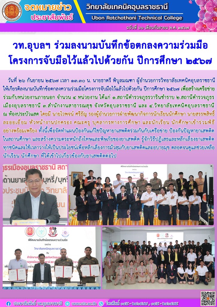 วันที่ ๒๖ กันยายน ๒๕๖๗ เวลา ๑๓.๓๐ น. นายธาตรี พิบูลมณฑา ผู้อำนวยการวิทยาลัยเทคนิคอุบลราชธานี ให้เกียรติลงนามบันทึกข้อตกลง (เพิ่มเติม…)
