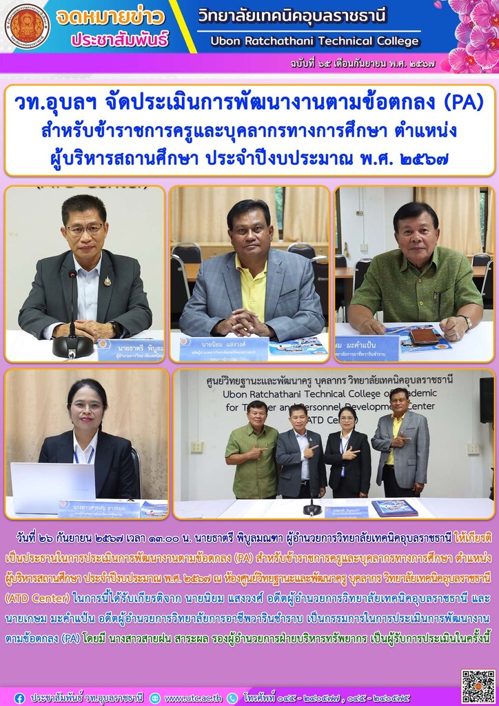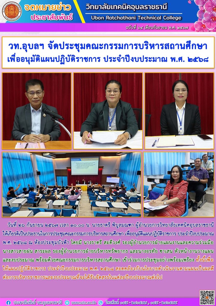 วันที่ ๒๖ กันยายน ๒๕๖๗ เวลา ๑๐.๐๐ น. นายธาตรี พิบูลมณฑา ผู้อำนวยการวิทยาลัยเทคนิคอุบลราชธานี ให้เกียรติเป็นประธานในการประชุม (เพิ่มเติม…)