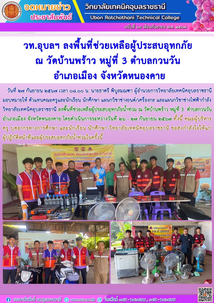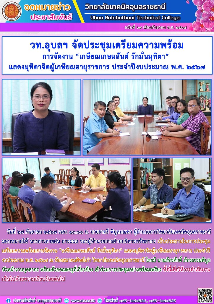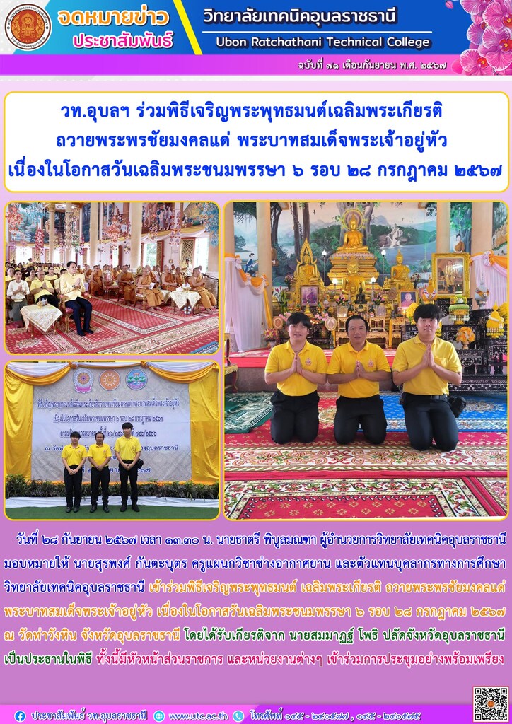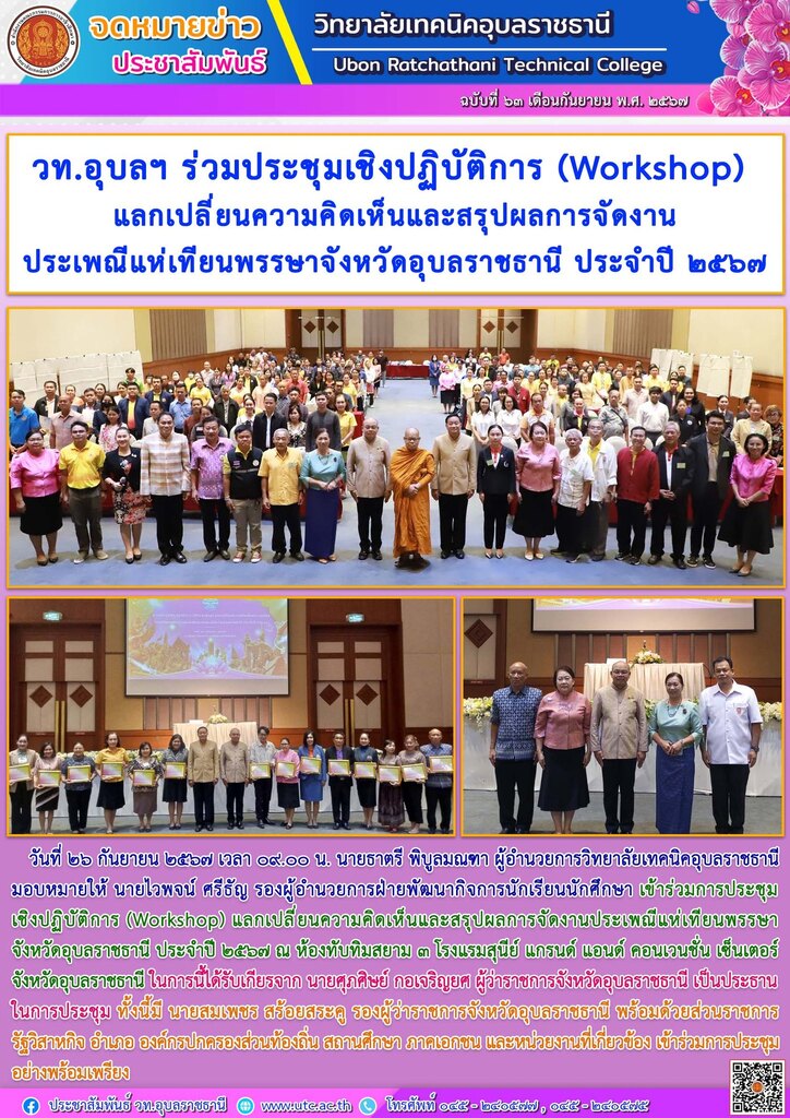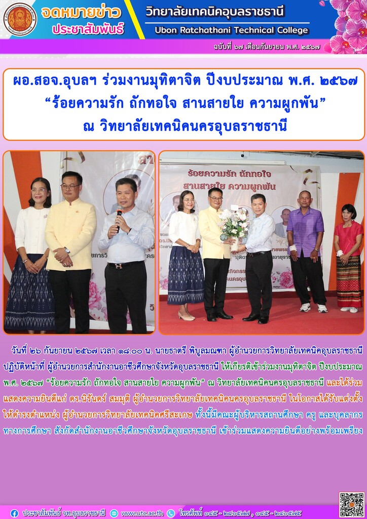 วันที่ ๒๗ กันยายน ๒๕๖๗ เวลา ๑๘.๐๐ น. นายธาตรี พิบูลมณฑา ผู้อำนวยการวิทยาลัยเทคนิคอุบลราชธานี (เพิ่มเติม…)