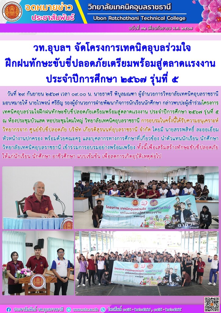 วท.อุบลญ จัดโครงการเทคนิคอุบลร่วมใจฝึกฝนทักษะขับขี่ปลอดภัยเตรียมพร้อมสู่ตลาดเเรงงาน ประจำปีการศึกษา ๒๕๖๗ รุ่นที่ ๕