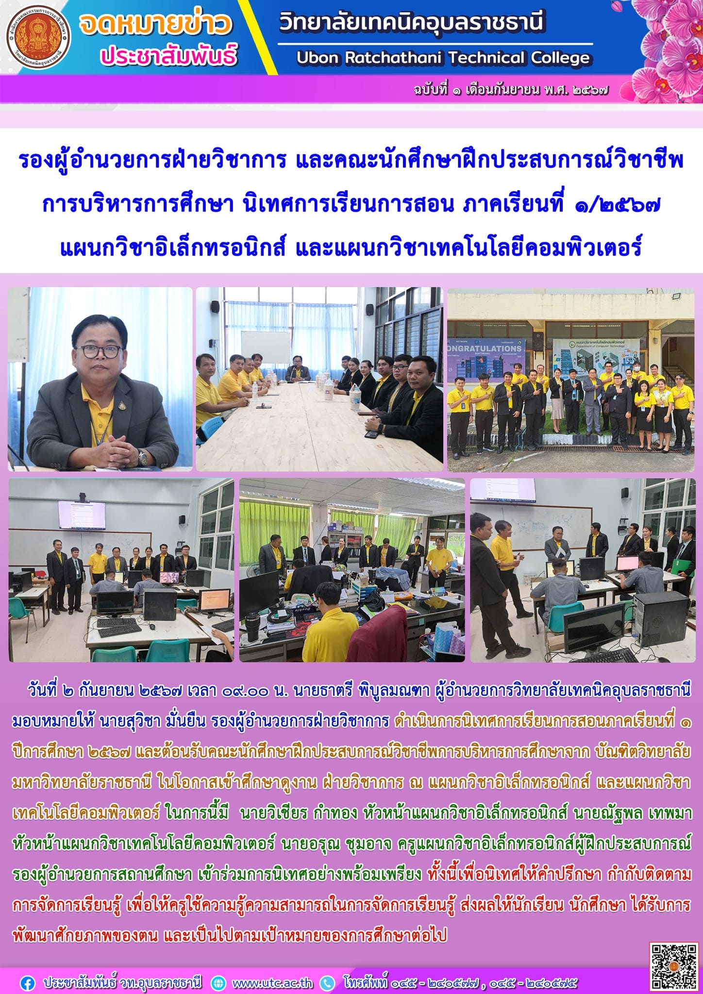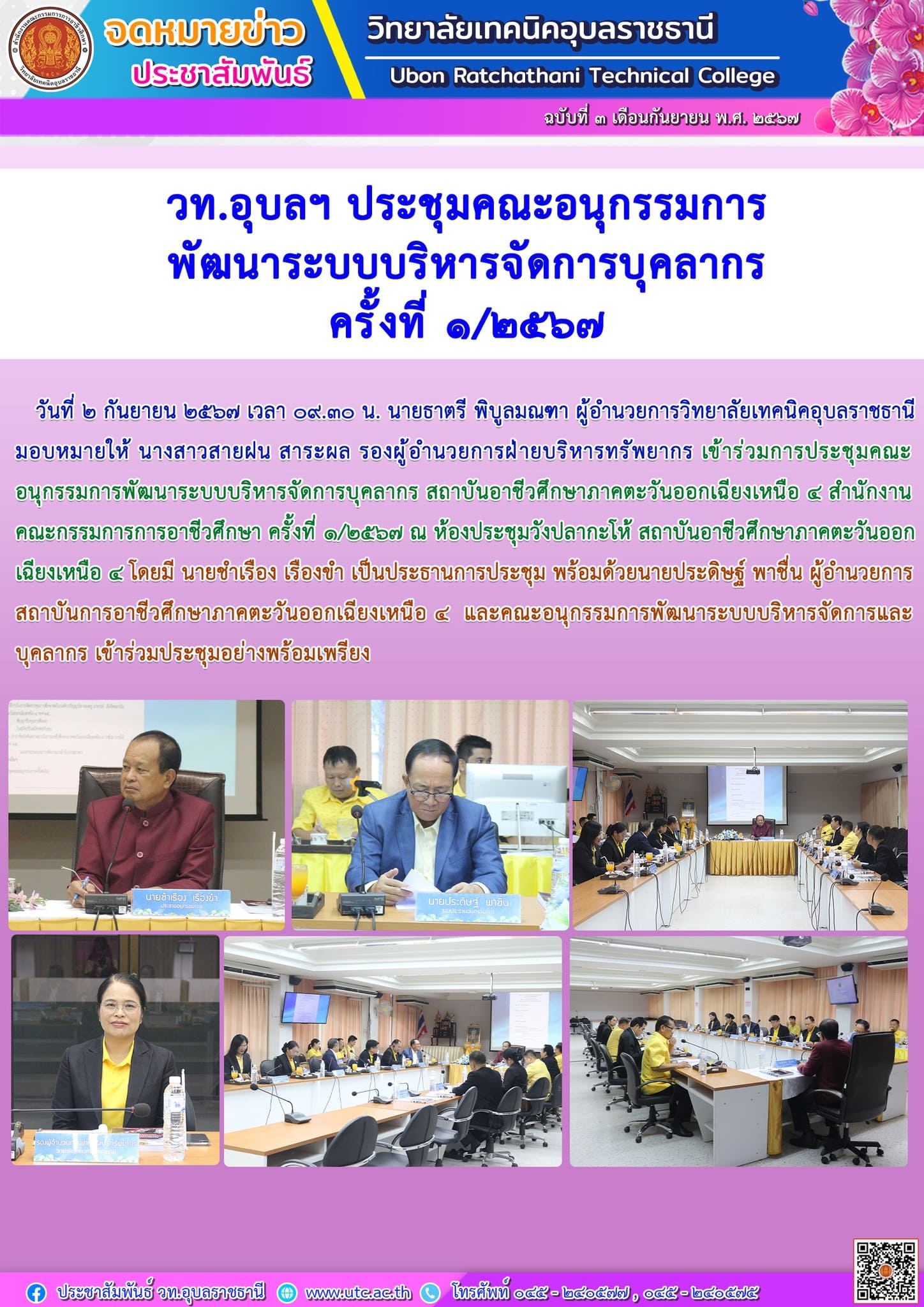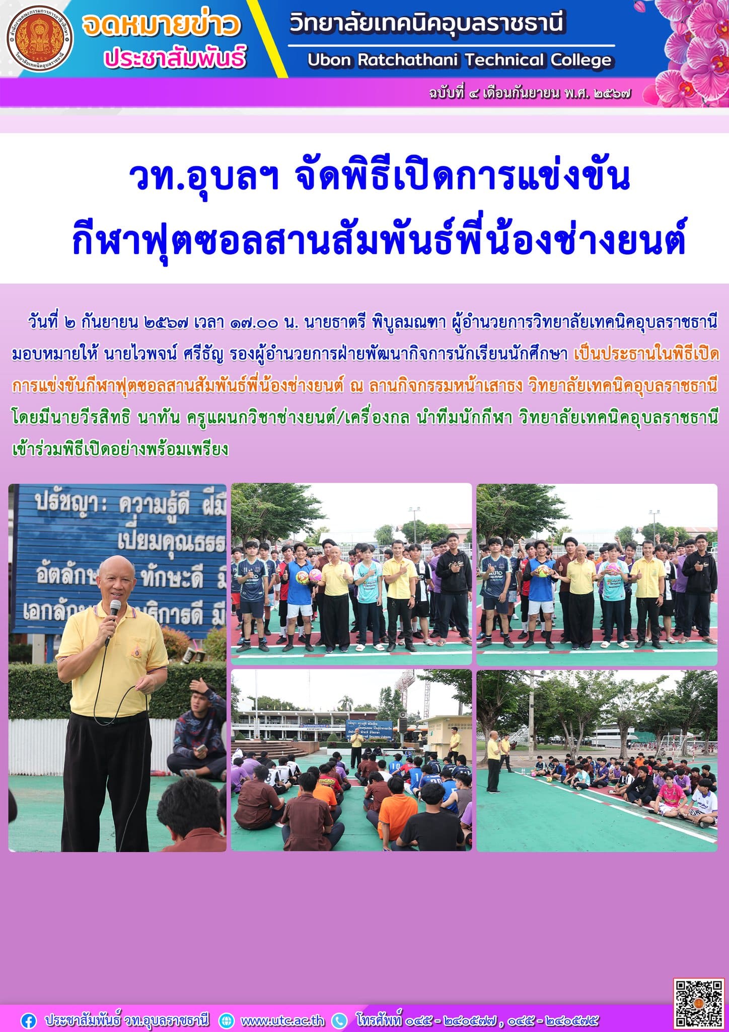 วันที่ ๔ กันยายน ๒๕๖๗ เวลา ๐๙.๐๐ น. นายธาตรี พิบูลมณฑา ผู้อำนวยการวิทยาลัยเทคนิคอุบลราชธานี (เพิ่มเติม…)