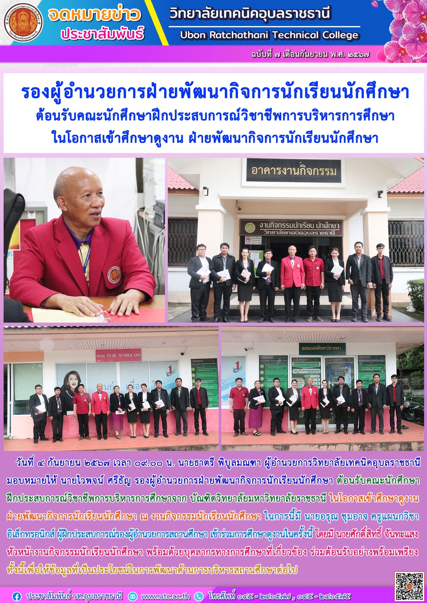 รองผู้อำนวยการฝ่ายพัฒนากิจการนักเรียนนักศึกษา ต้อนรับคณะนักศึกษาฝึกประสบการณ์วิชาชีพการบริหารการศึกษา ในโอกาสเข้าศึกษาดูงาน พัฒนากิจการนักเรียนนักศึกษา