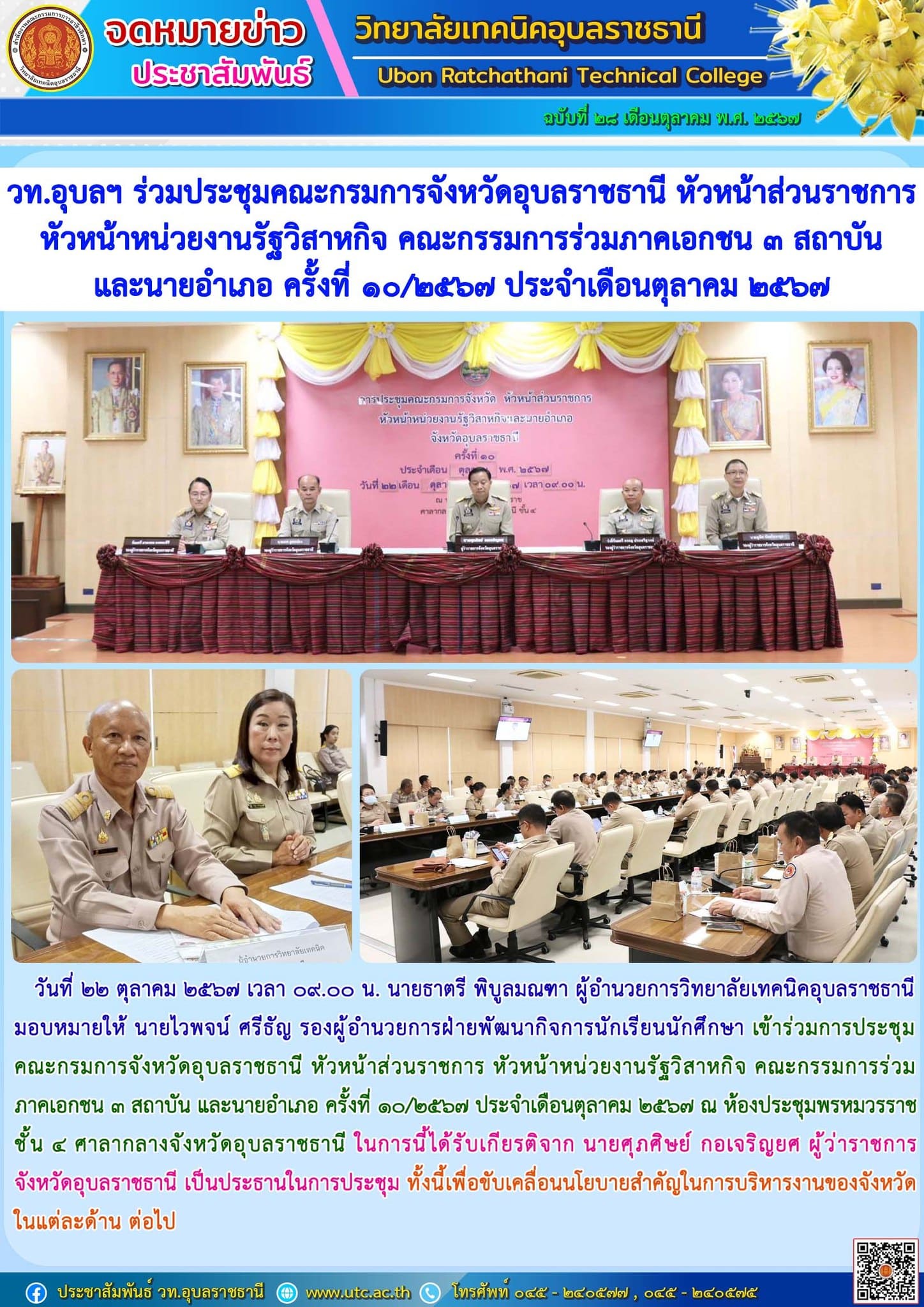 วันที่ ๒๖ ตุลาคม ๒๕๖๗ เวลา ๐๙.๐๐ น. นายธาตรี พิบูลมณฑา ผู้อำนวยการวิทยาลัยเทคนิคอุบล (เพิ่มเติม…)