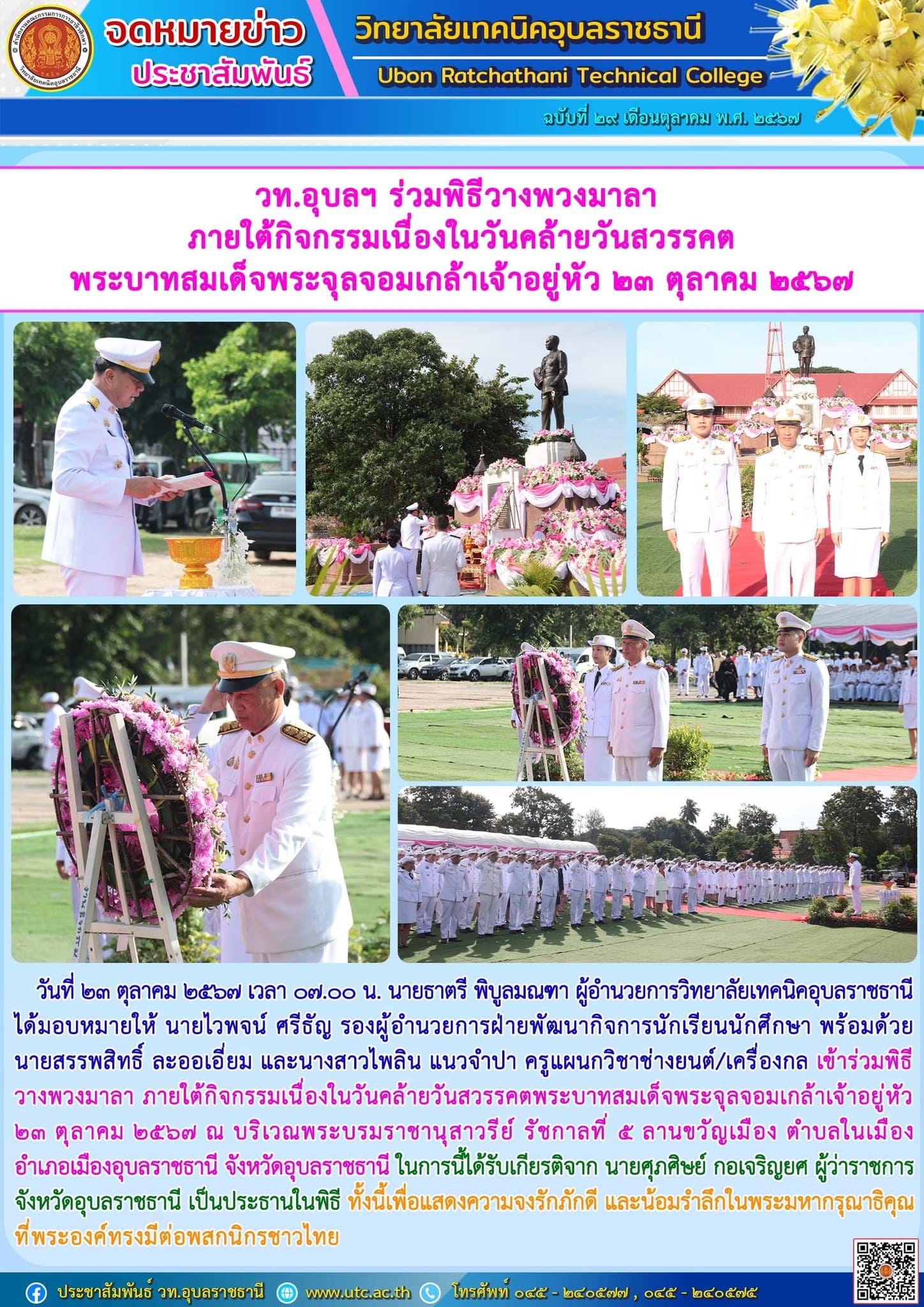 วันที่ ๒๓ ตุลาคม ๒๕๖๗ เวลา ๐๗.๐๐ น. นายธาตรี พิบูลมณฑา ผู้อำนวยการวิทยาลัยเทคนิคอุบล (เพิ่มเติม…)