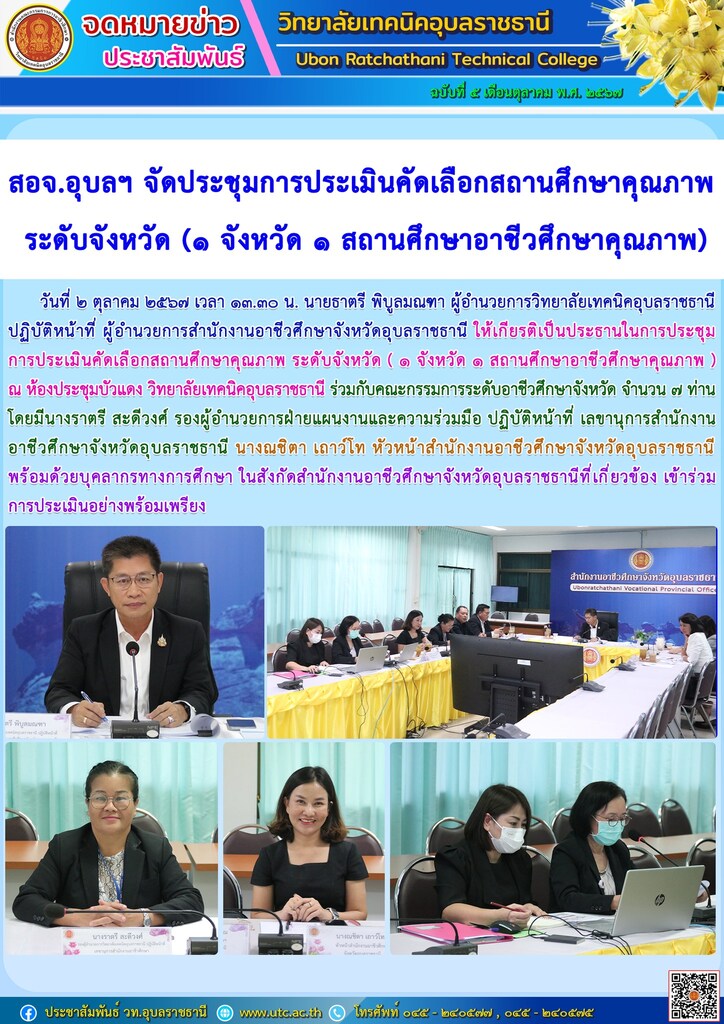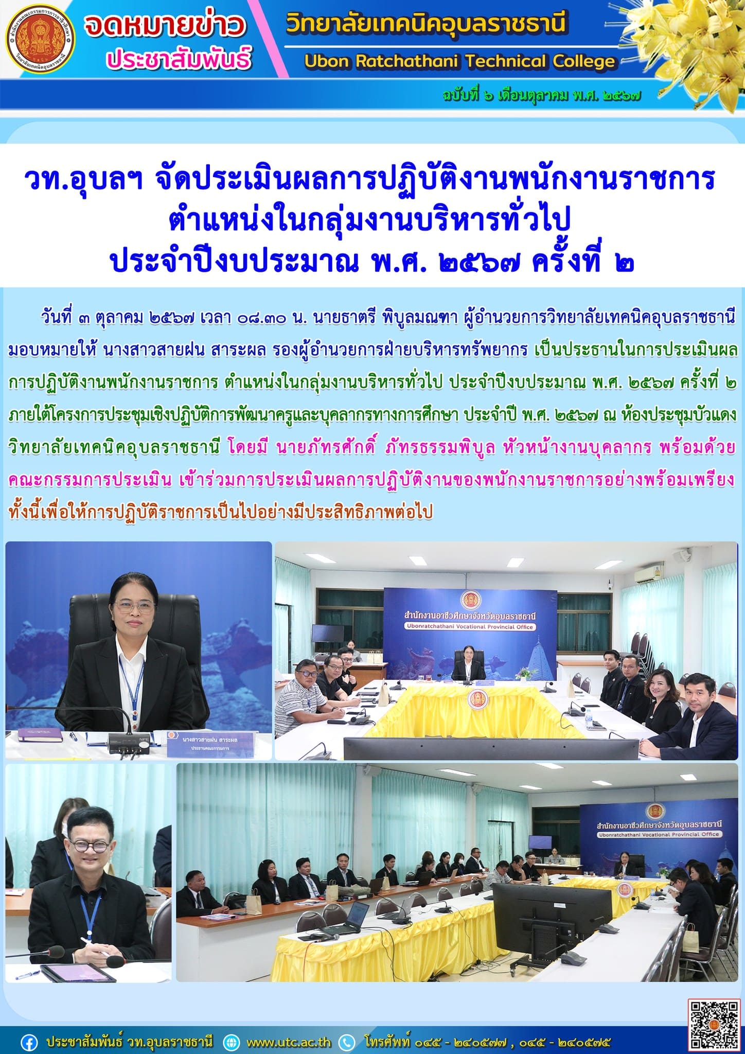 วันที่ ๗ ตุลาคม ๒๕๖๗ เวลา ๑๓.๐๐ น. นายธาตรี พิบูลมณฑา ผู้อำนวยการวิทยาลัยเทคนิคอุบลราชธานี มอบหมายให้ นางสาวสายฝน สาระผล รองผู้อำนวยการฝ่ายบริหารทรัพยากร เป็นประธานในการประชุม (เพิ่มเติม…)